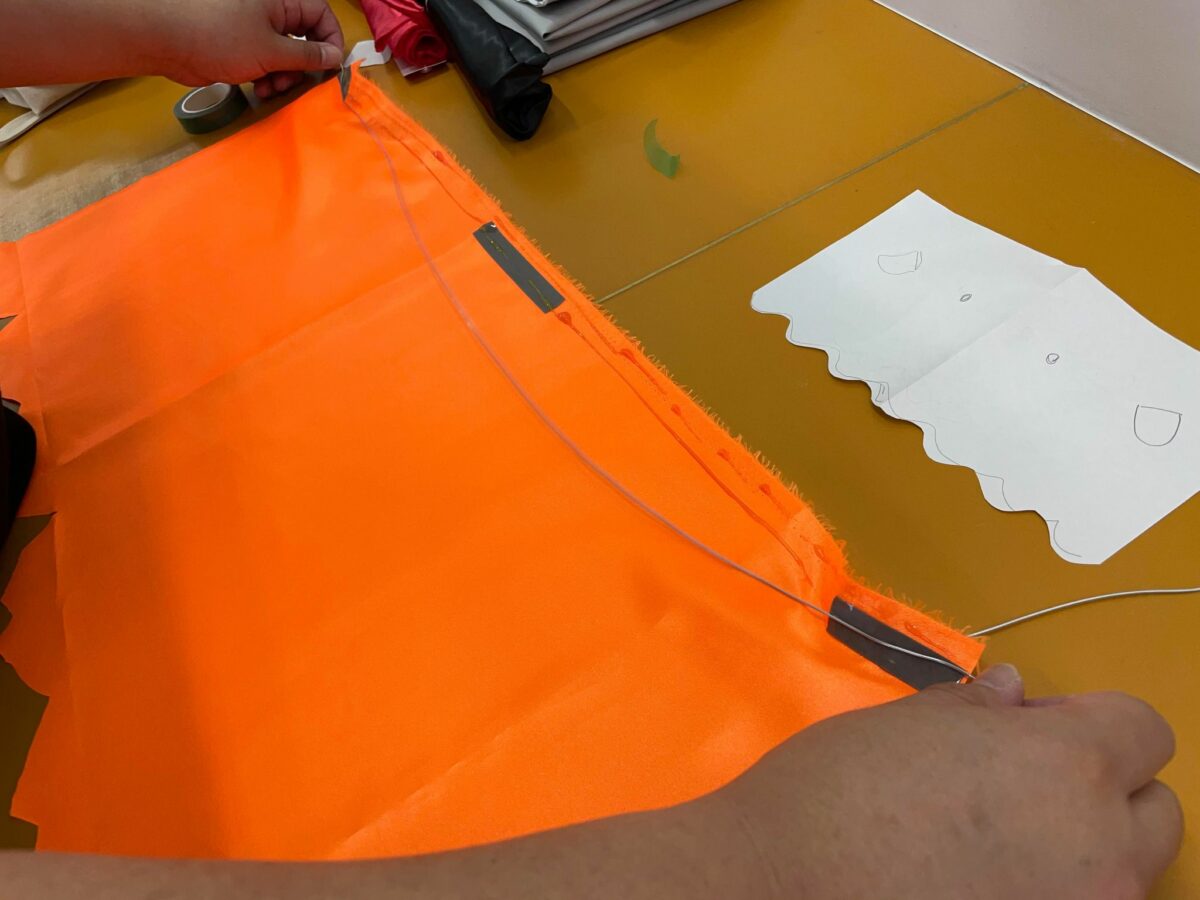 適当なスケッチからオレンジの端切れを切り出し、片方の辺をギザギザに。反対の長辺に針金を巻き込んで接着していく。