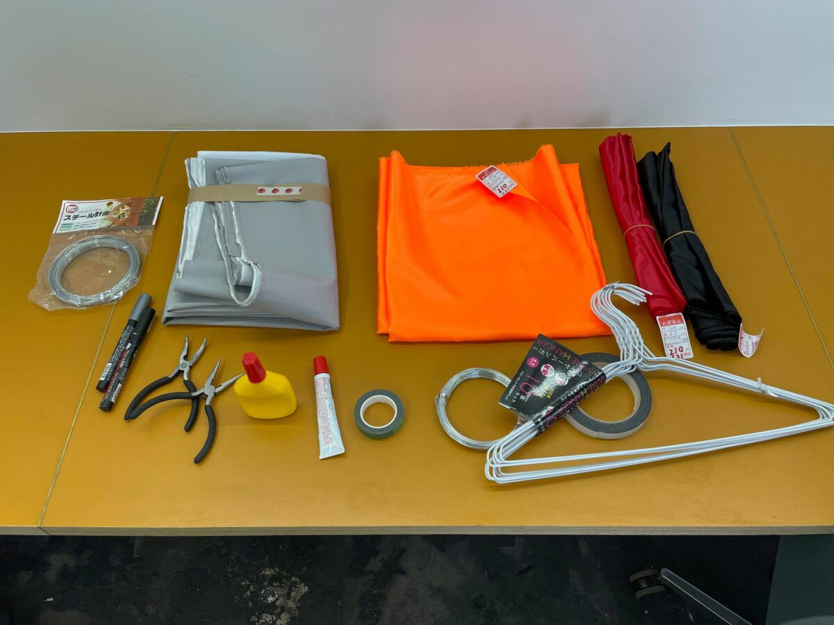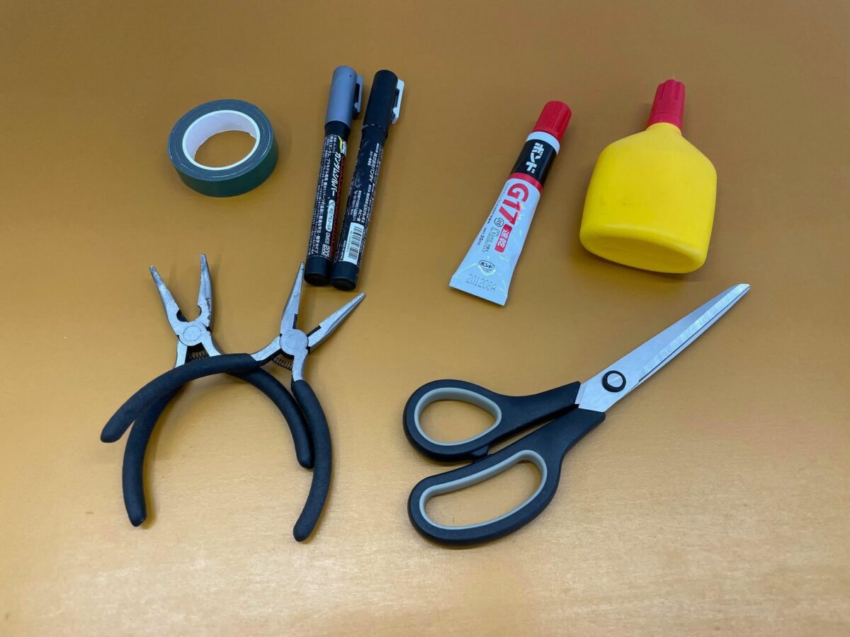 布を切るハサミと接着用のボンド&両面テープ、あと針金を扱うのでペンチがあるといい。