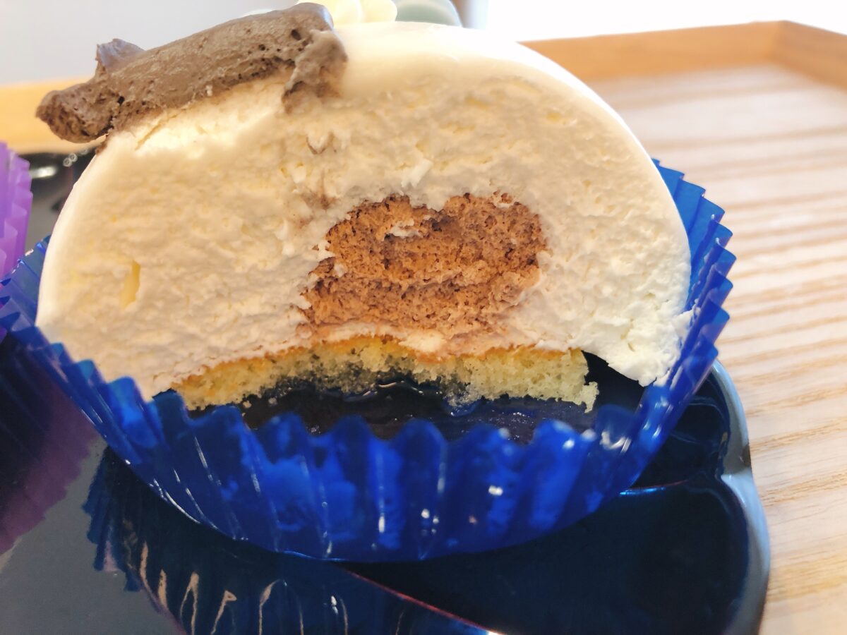 白いバニラ風味のムースからは、チョコレートのムースが出てきました。バニラのムースは、カスタードのように強いバニラ感というよりは、ミルクっぽいクリーミーな風味にほんのりバニラを感じる程度で、中のチョコレートムースを引き立てていました。チョコレートムースは苦味がないミルクチョコのような味で、小さなお子様にも喜ばれそうな味だと思いました。全体的に甘すぎない印象で、さらにムースがケーキのほとんどを占めているので、軽い食感でペロリと食べてしまえるのですが、食べ終わった後のお腹には確かな満足感!食後のデザートにちょうどいいと思いました。