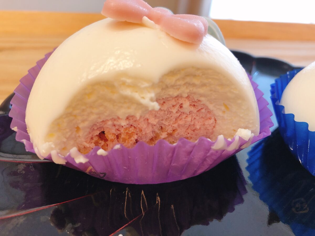中からは、かわいいピンク色のベリー風味のムースが出てきました!心なしか、ドナルドのチョコレートムースよりもたくさんベリーのムースが入っているように感じられました。ベリーのムースは、ベリーの香りは確かにあるとはいえ、ベリー系のムースによくある酸味はほとんど感じられなかったので、小さなお子様も抵抗なく食べられるのではないかな?と思います。また、時々感じる、スポンジの上に少し乗っていた砕いたクッキーが食感のアクセントになっていました。こちらもペロリと食べられますが、しっかりとボリュームを感じられる食べごたえで、満足度◎です!