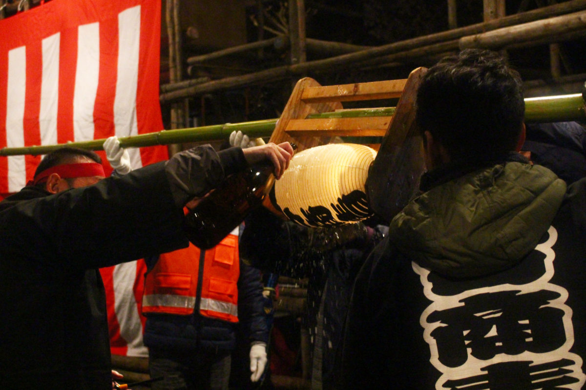 子ども部門の後は、大人によるさらに激しいもみ合いが予想されます。提灯にお神酒をかけて準備万端です!