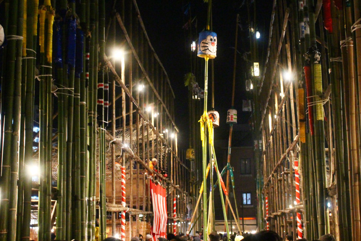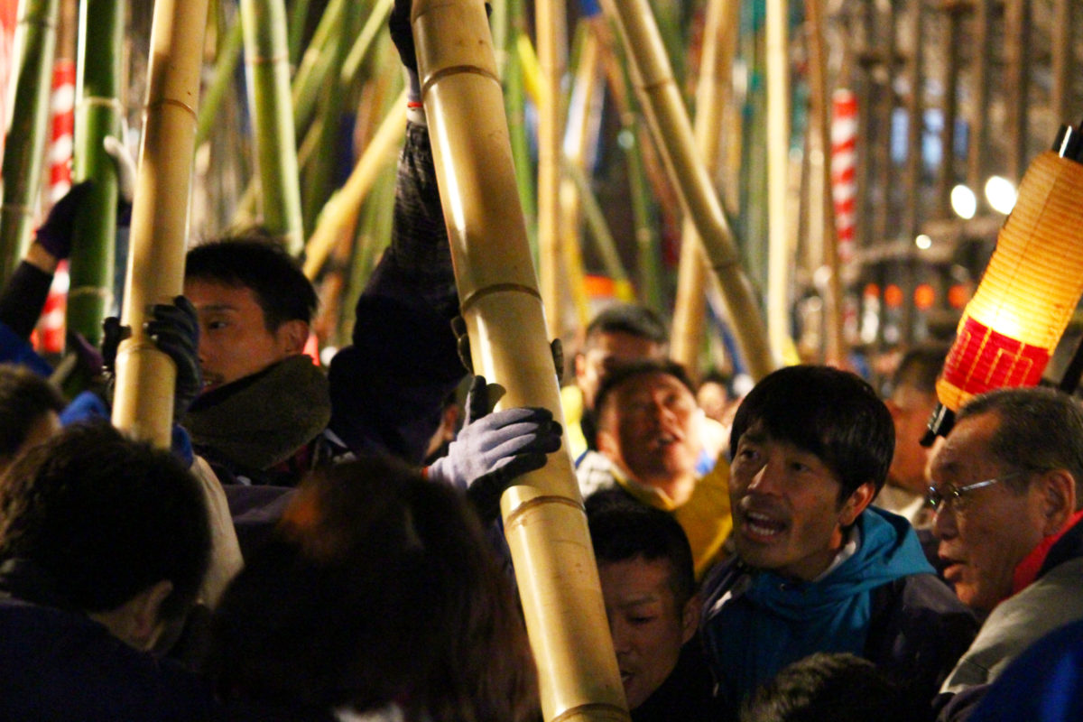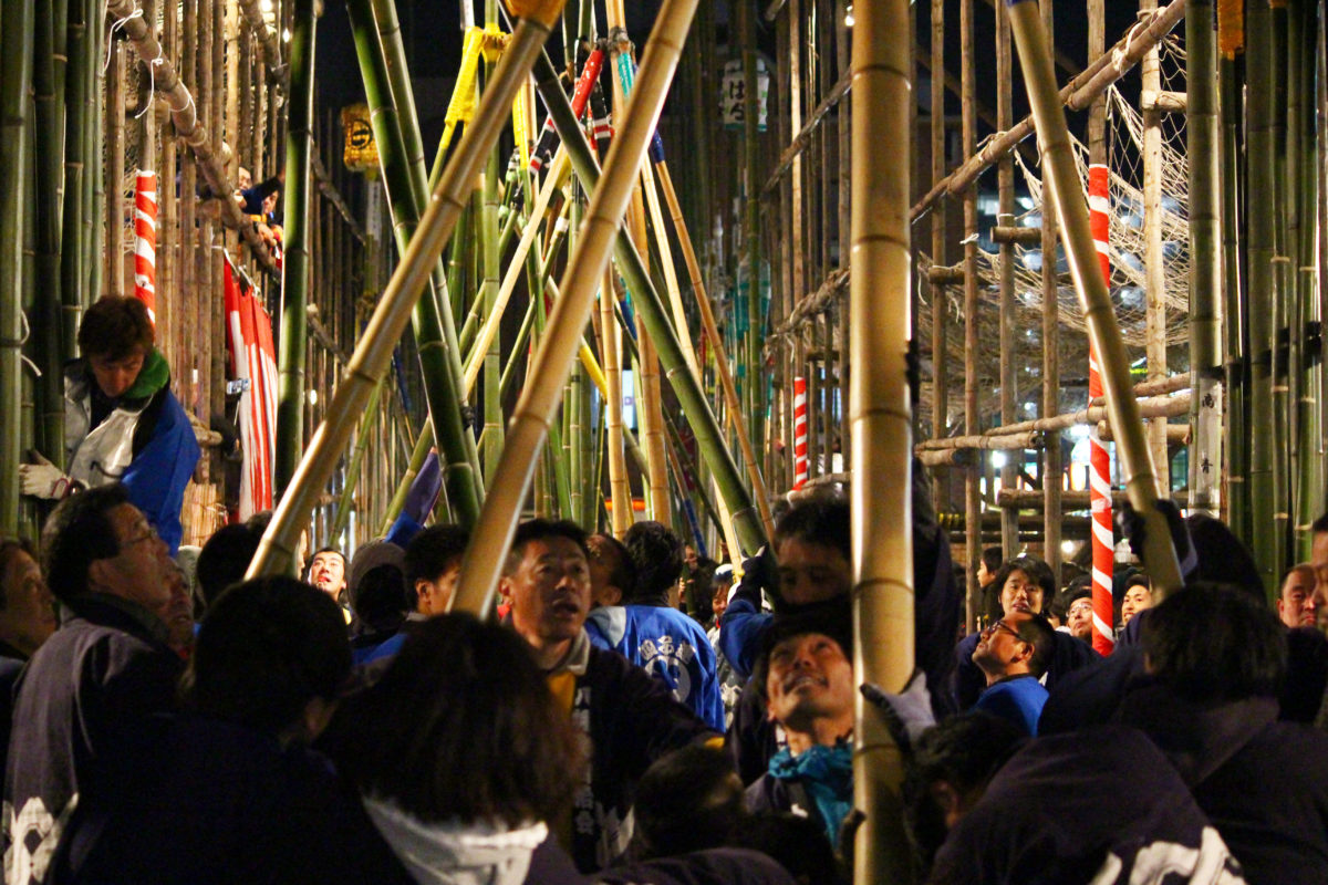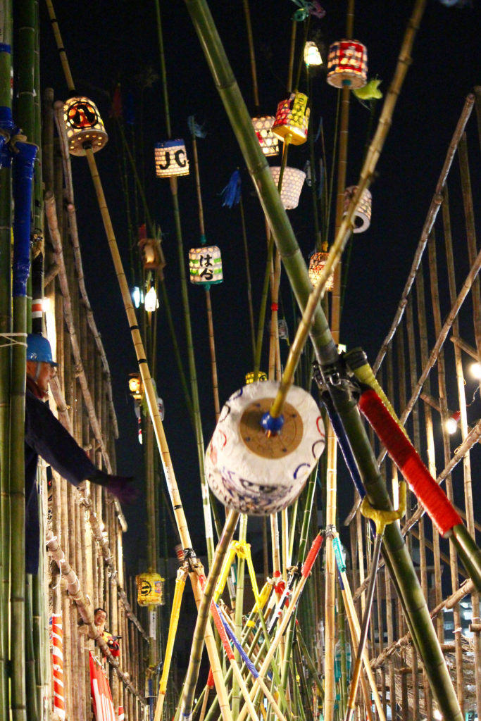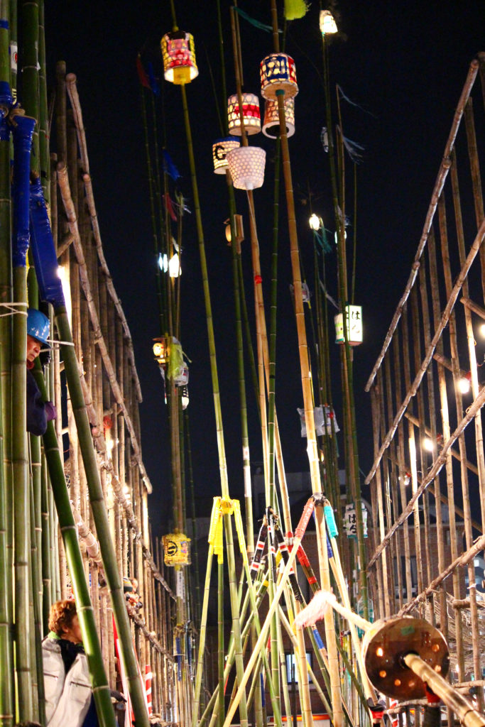 提灯の下では男達が真剣な表情で竿を動かしています。20mの提灯を掲げる竿を、3本の支柱の竿でうまくコントロールしていますね!
