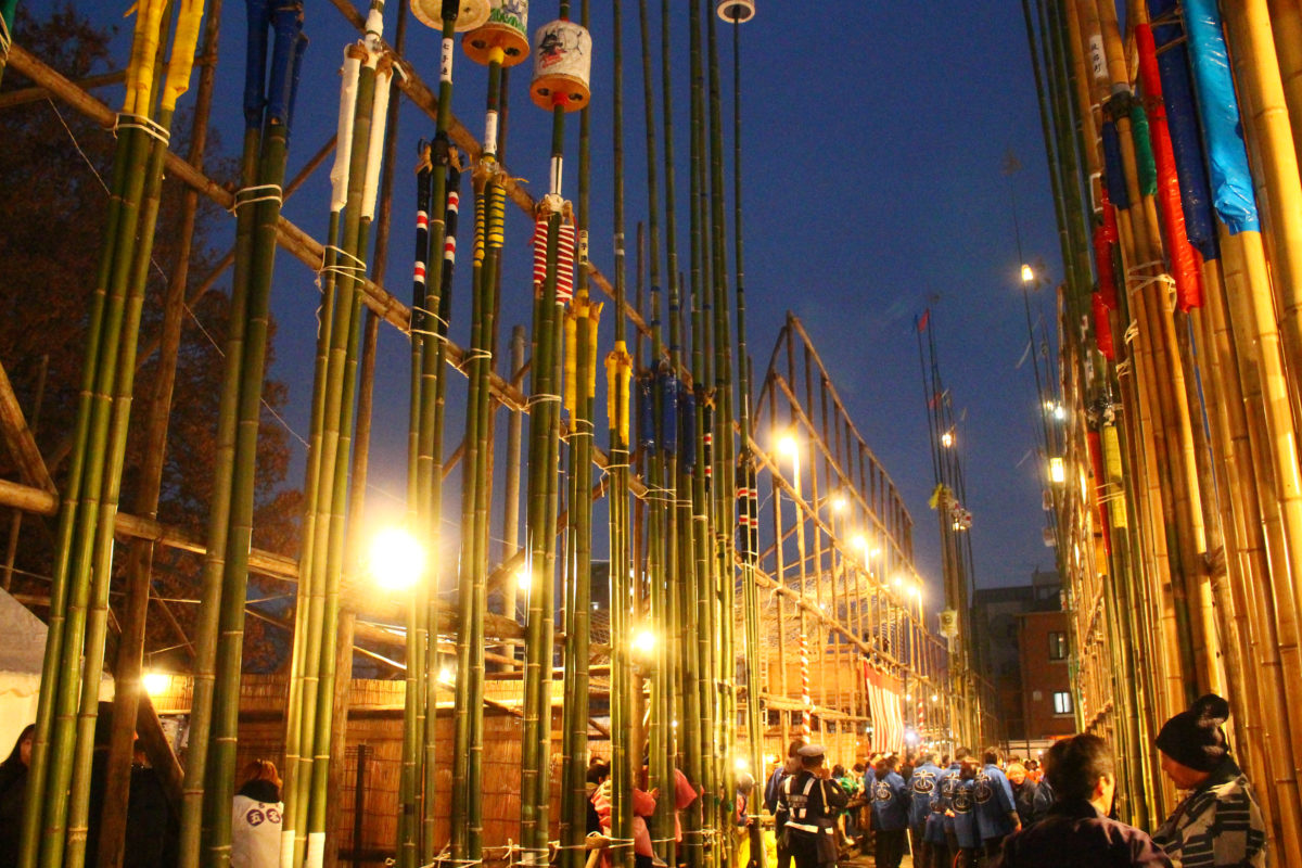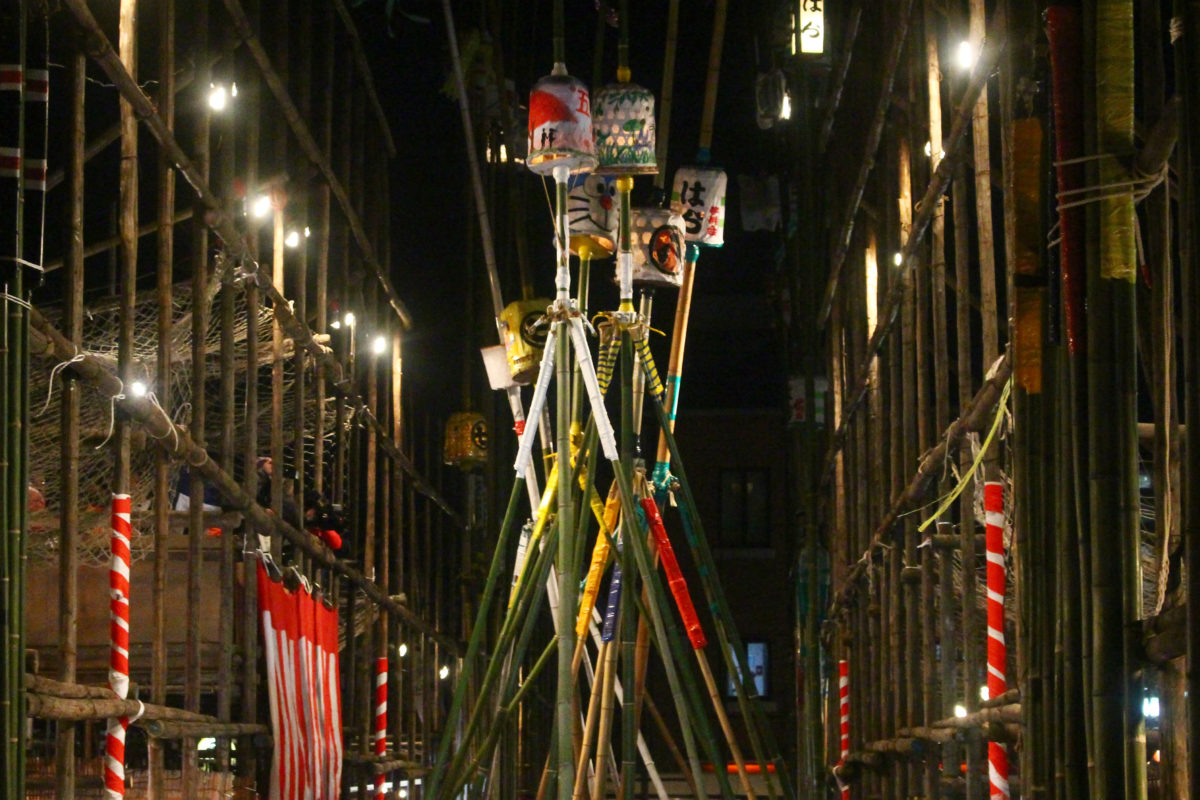 大人部門は「競技もみ」と「自由もみ」と呼ばれる2つの提灯竿もみが行われますが、まず行われるのが競技もみ。こちらはオーソドックスな提灯で統一されて、各町が競い合います。なんと、大人部門の竿は長さが20mもあるんだとか!