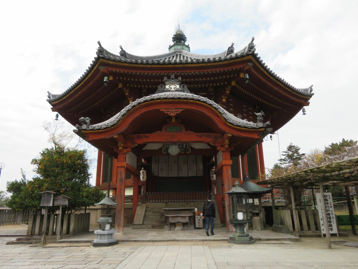 五重塔から中金堂前の参道を南に向かうと南円堂に突き当たります。813年に藤原冬嗣が父の内麻呂の追善のために建立したと伝わります。基壇築造のときには地神を鎮めるために、和同開珎や隆平永宝を撒きながら作業が進められたことが発掘調査で明らかになっています。現在の建物は、1789年に再建されたものです。