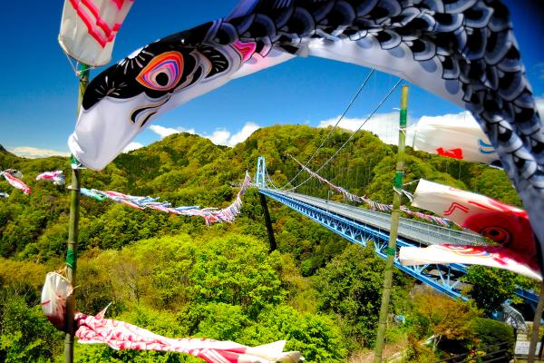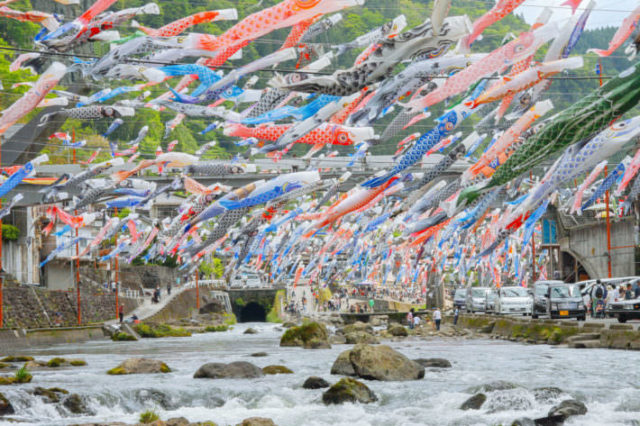 熊本県の最北端に位置し、大分県境にもほど近い名湯で知られる杖立温泉で開催。河川をまたいで鯉のぼりを泳がせる祭は全国で開催されていますが、実はその発祥地とされるのがこの杖立温泉。山間の河川にかかる約3500匹もの鯉のぼりの姿はまさに圧巻。インスタに最適です。