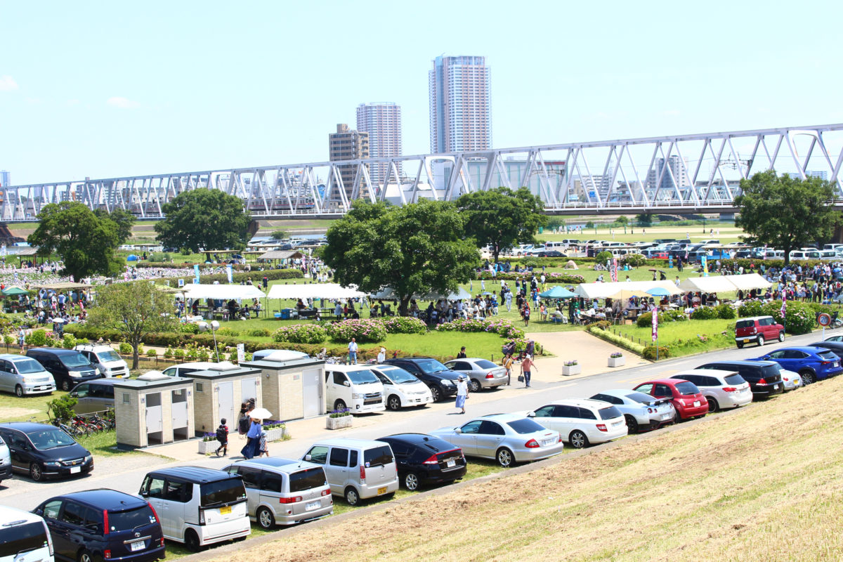 堤防に上がると、すでに多くの人が!陸橋の架かる中央には江戸川が流れており、その河川敷に広がるこちらがお祭りの会場です!