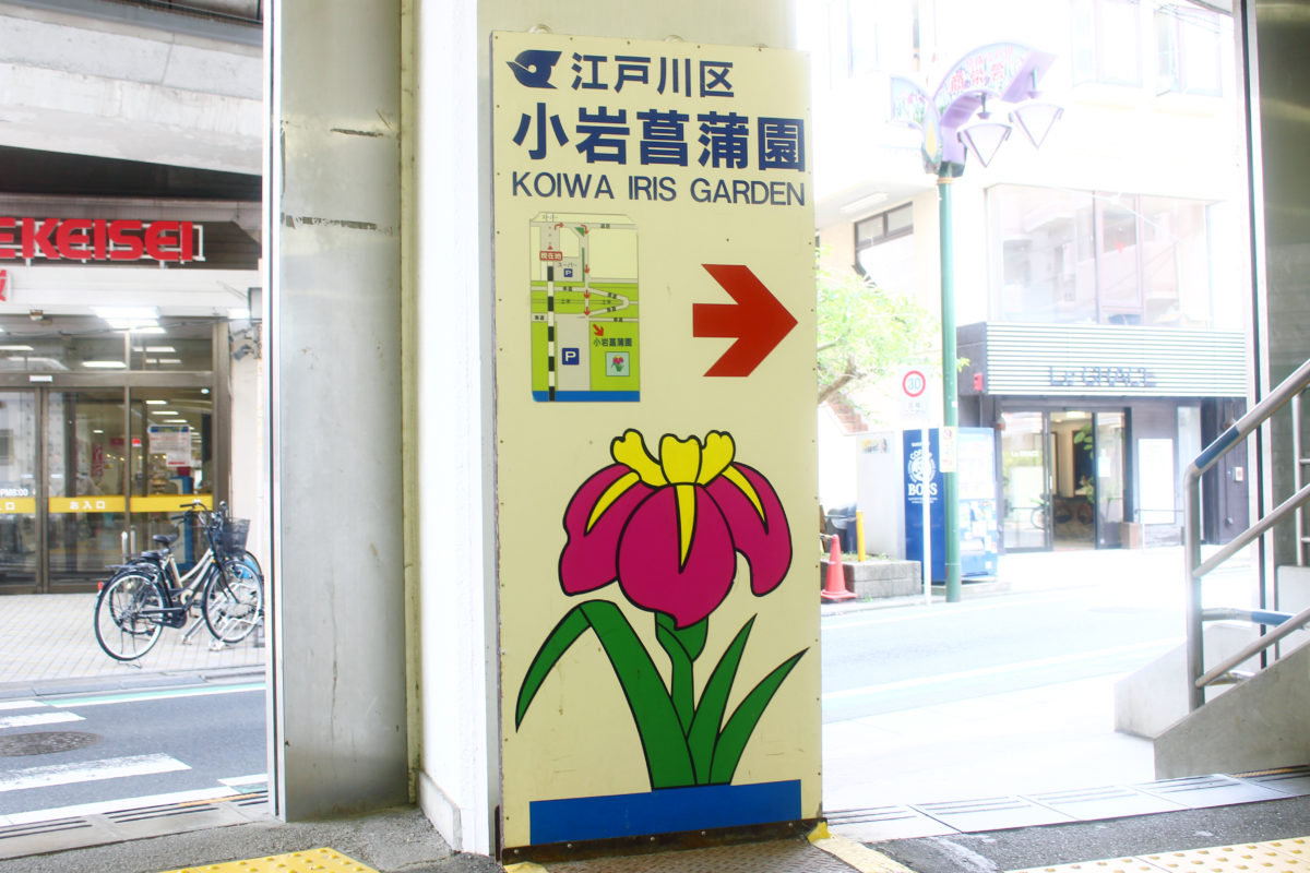 上野から京成本線に乗ること30分弱で来ることができる江戸川駅。駅の改札を出ると、早速お祭りが行われている小岩菖蒲園の案内看板が出ています!