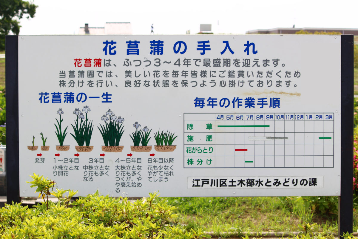 小岩菖蒲園では、なんと100種類5万本もの花菖蒲が植えられているのだとか!花菖蒲はこちらの看板にあるように、見ごろを迎えるまでに3-4年かかるそうです。見事な花菖蒲が見られるのも、手入れをいただいている方々のおかげでありがたいですね!また美しく花を見られるように株分けと言う技法も行われており、本当に手間がかかっています!