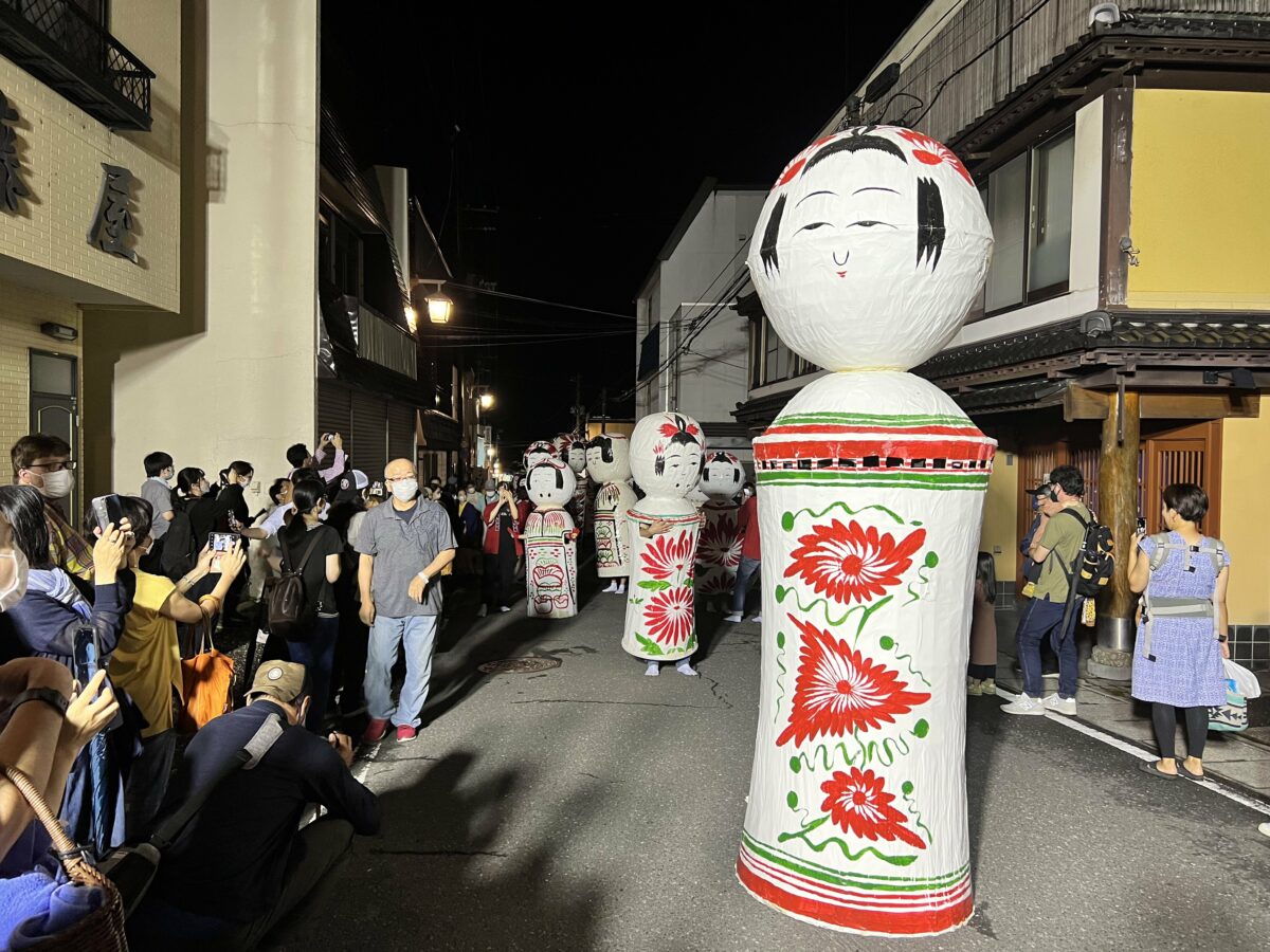 一体ごとに顔や模様が異なる「張りぼてこけし」がぬらぬらと通りを跋扈する。こ、これはまさに進撃のこけし!