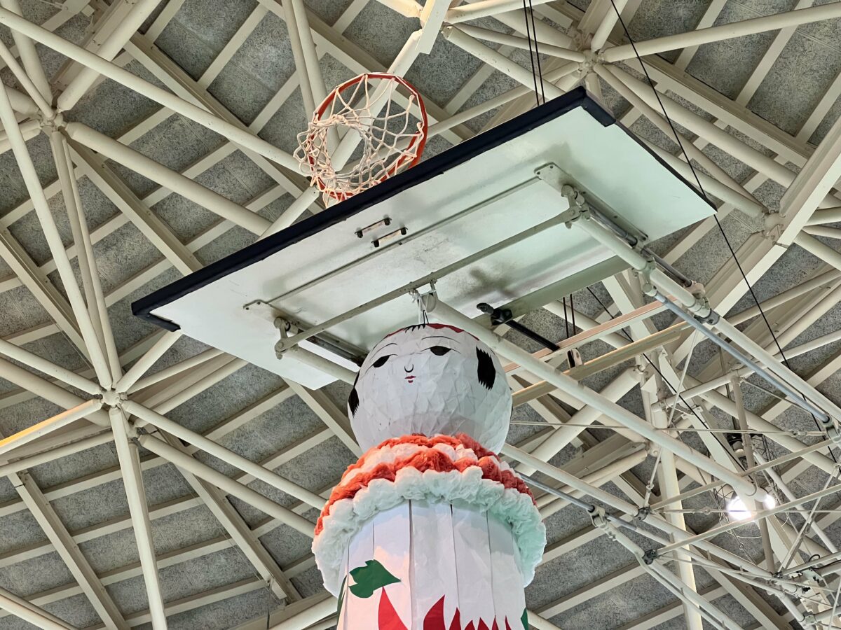 バスケのゴールに吊るされたこけし。現状への諦念からか、はかなげに遠くを見つめているようだ。