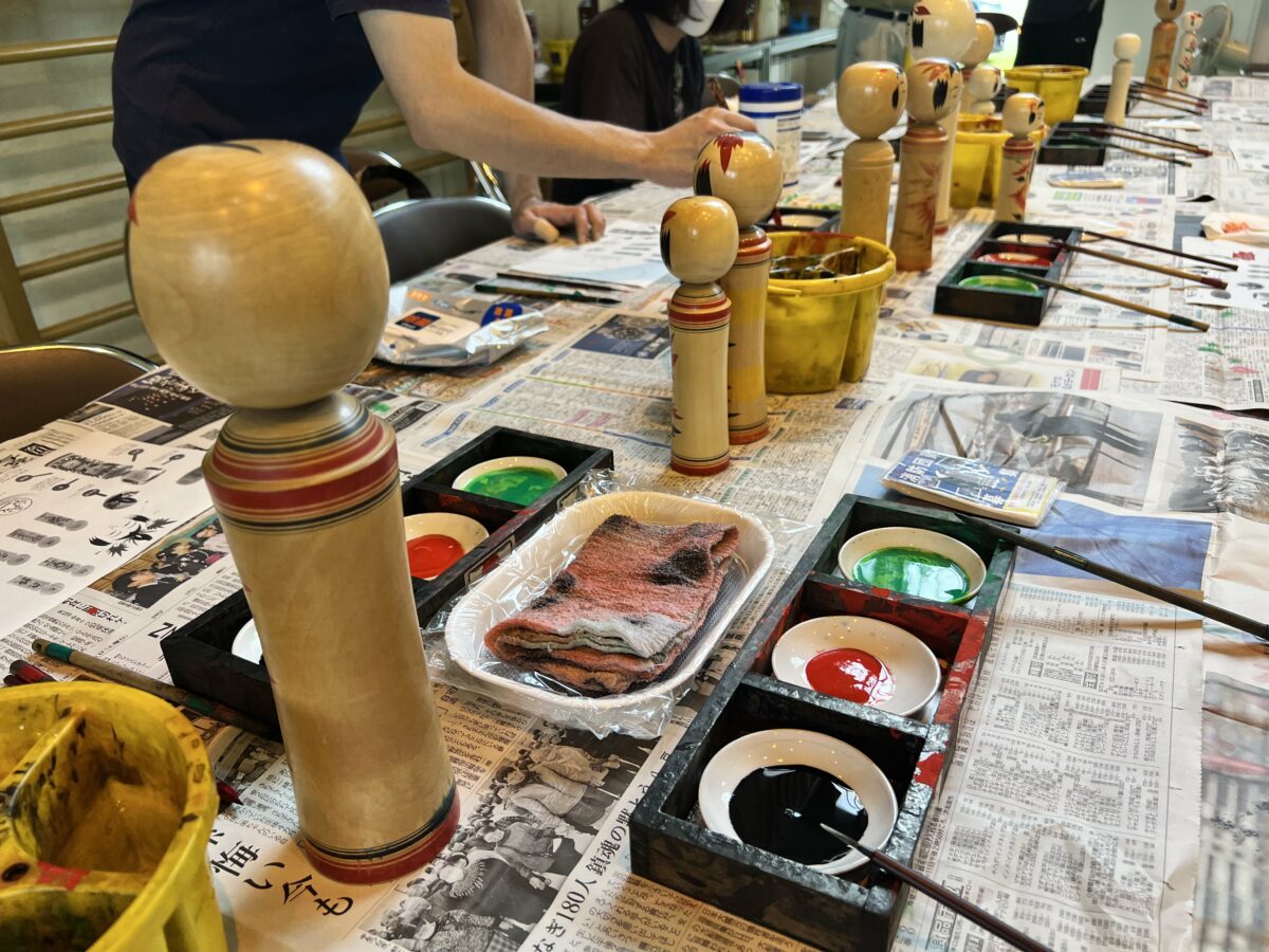会場では、赤・緑・黒のトリコロール・カラーを使った鳴子こけしの絵付け体験もできます。