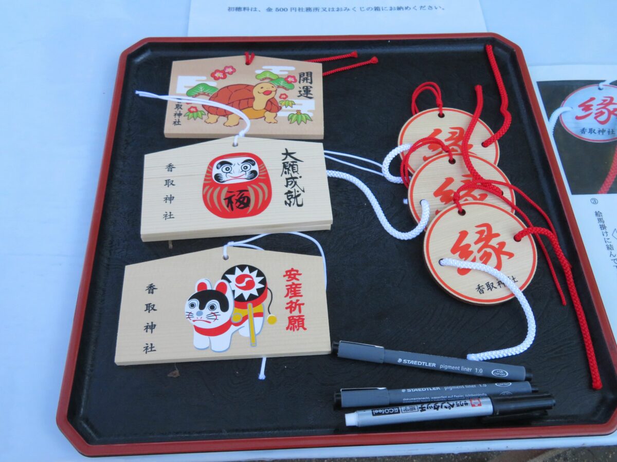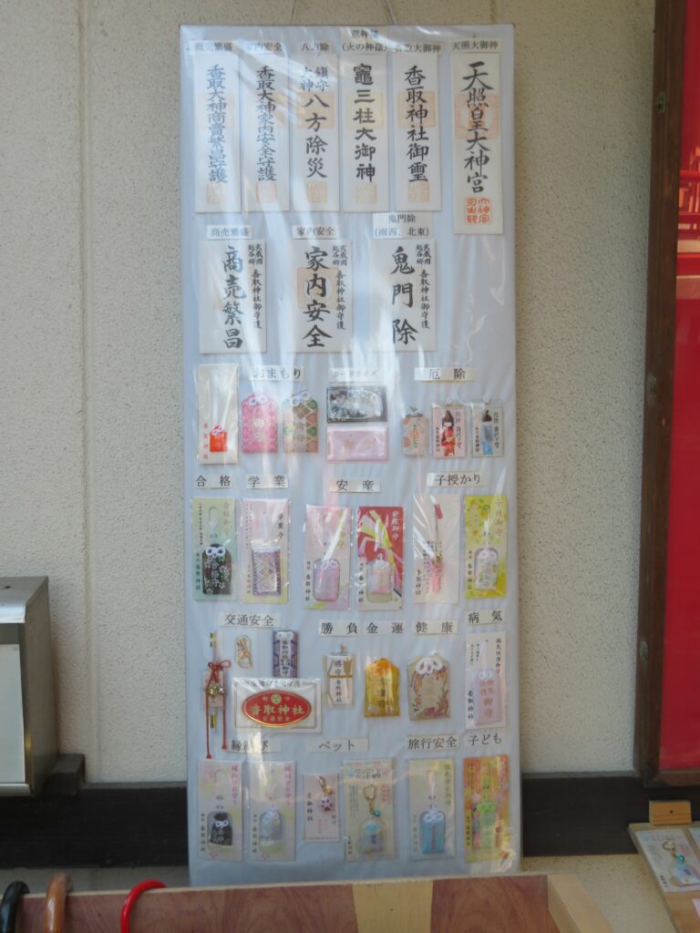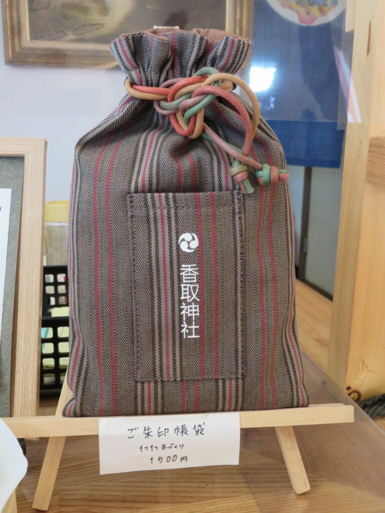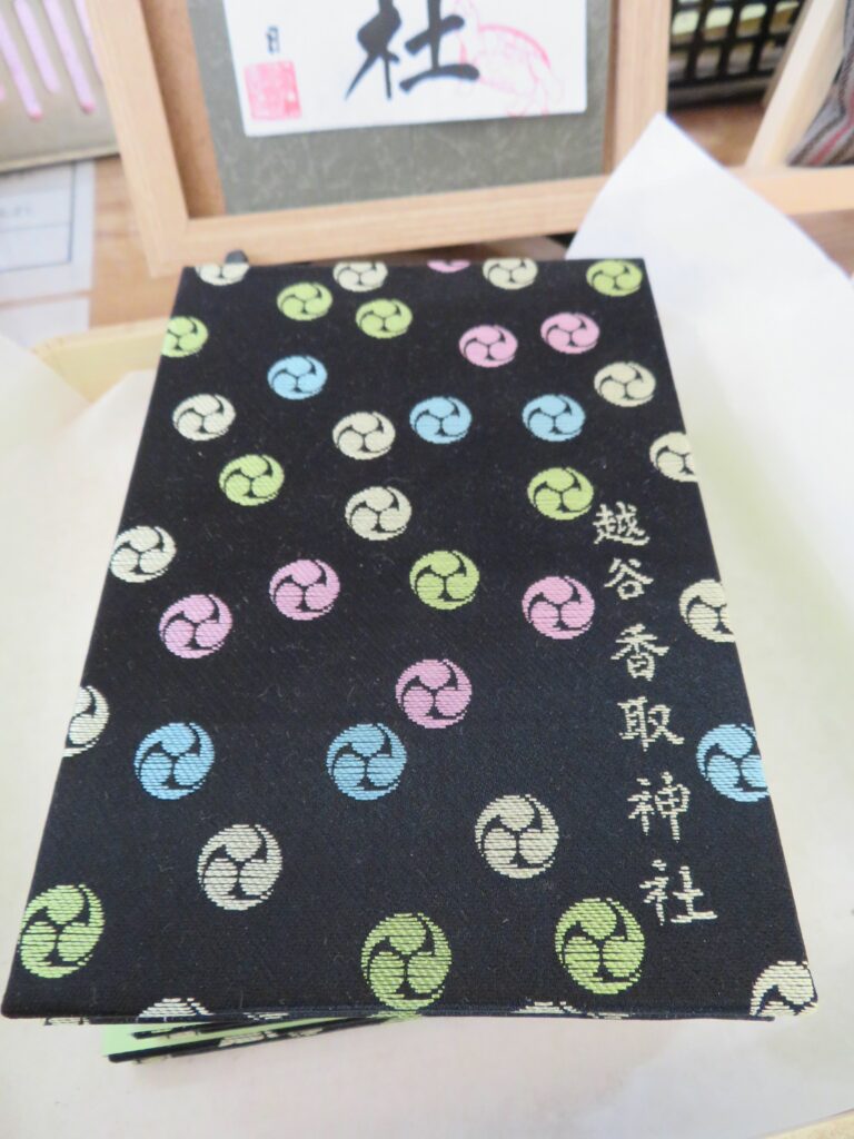 拝殿の西に建つ社務所では、参拝記念の御朱印を頂くことができます。窓口では通年の御朱印、期間限定の御朱印の他にも、オリジナルの御朱印帳、御朱印袋、各種の授与品が並びます。