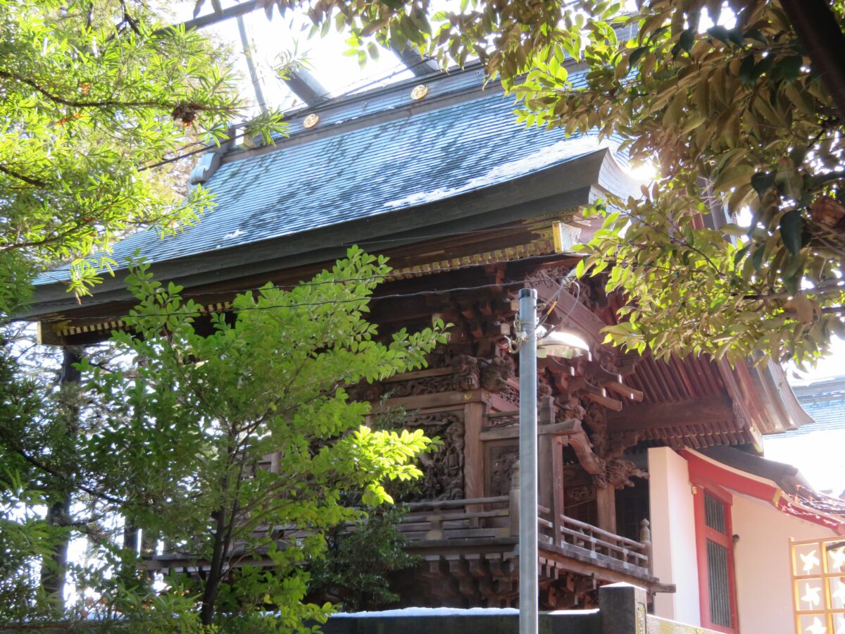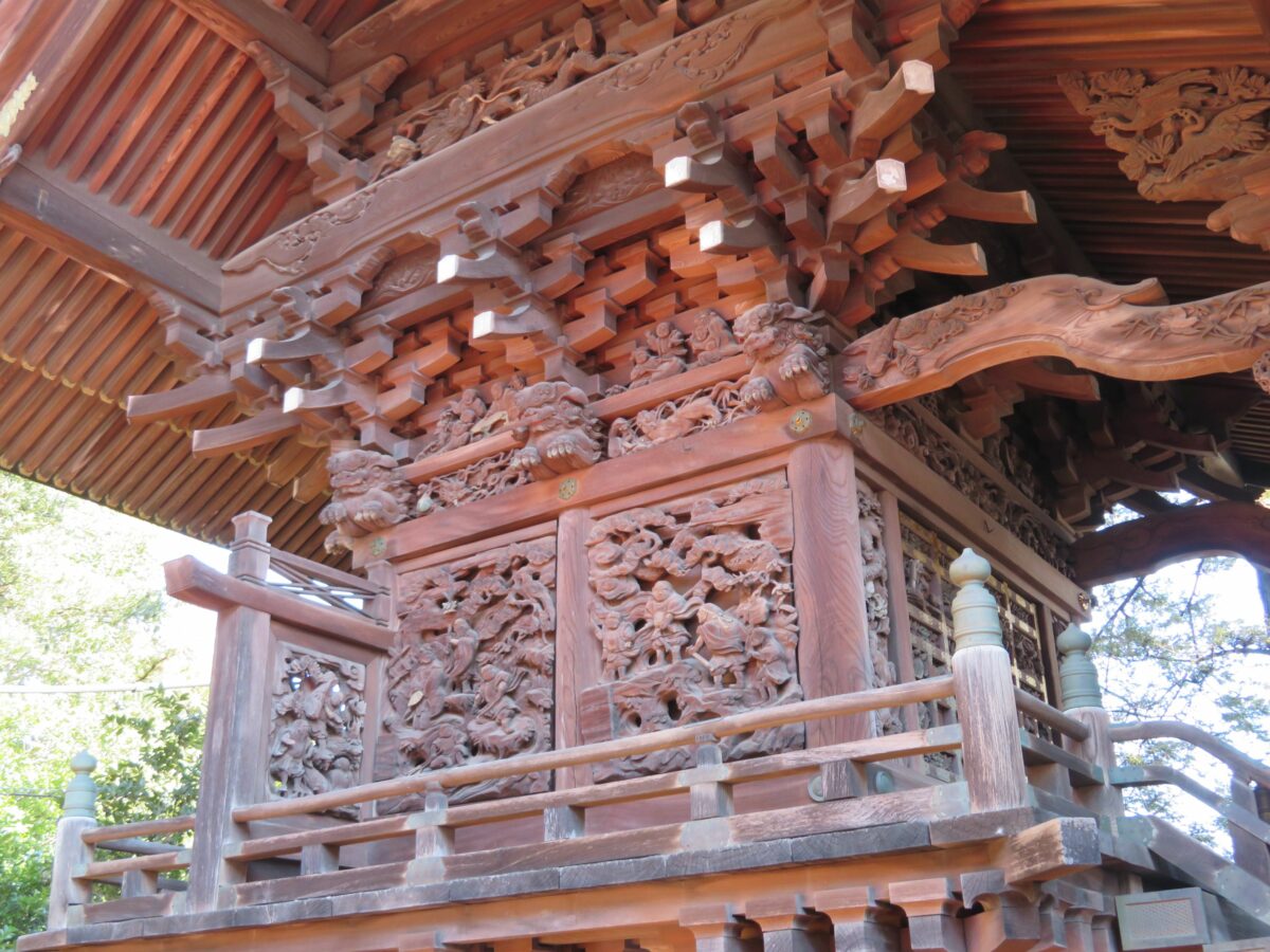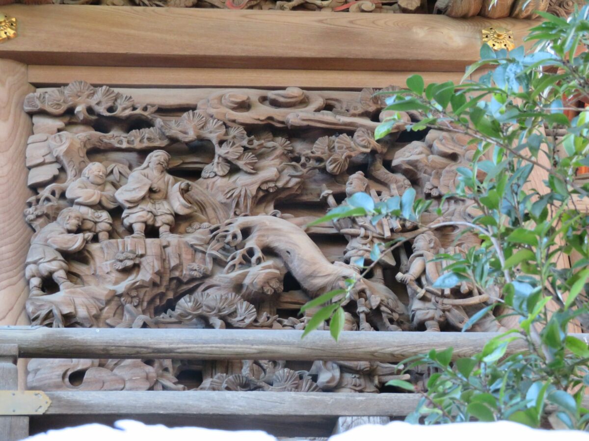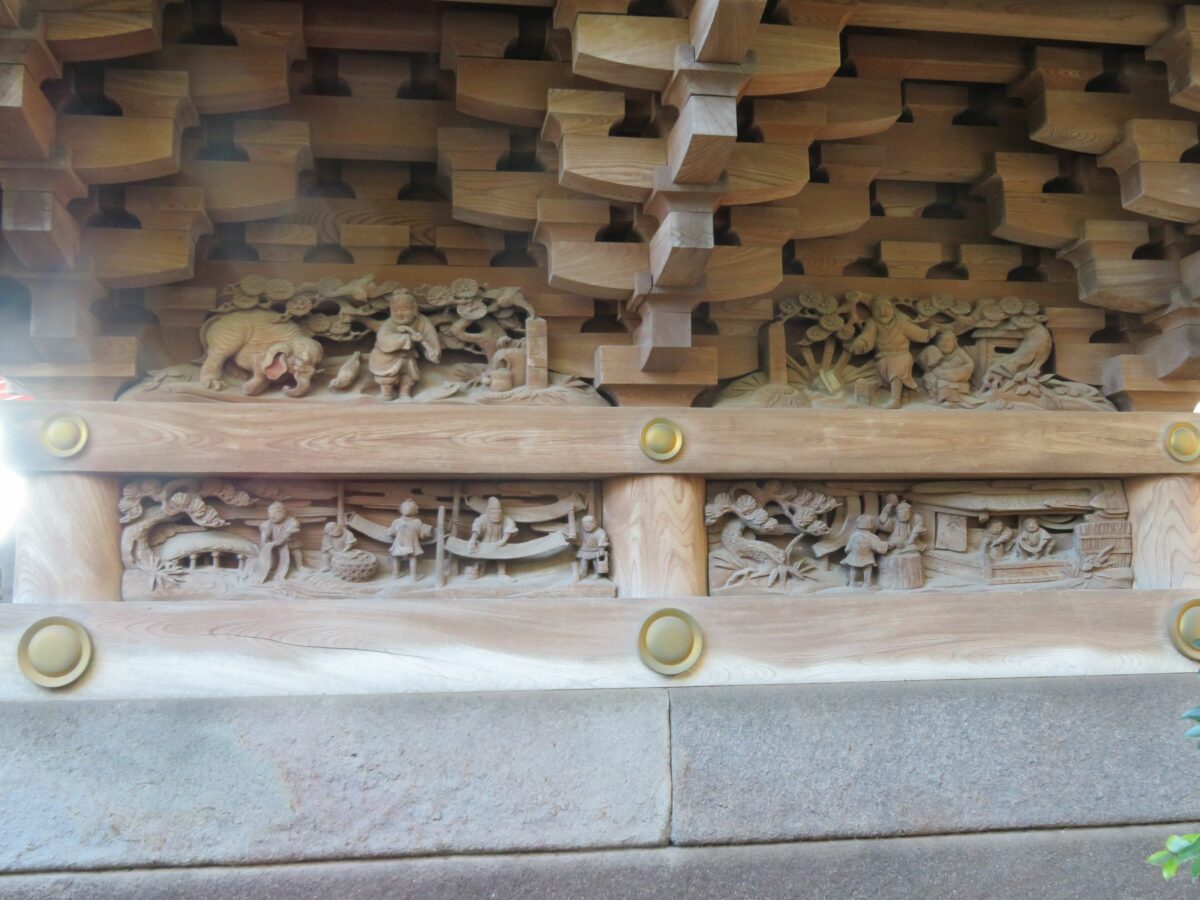 奥殿を囲む板壁は緻密な彫刻で装飾されています。北面の上部には、源頼光が山伏に変装して大江山の酒呑童子の鬼退治に行く様子が描かれています。床下に上下に並ぶ彫刻には、中国の24人の孝行者の物語『二十四孝』で記される郭巨、紺屋の作業風景が刻まれています。越谷には江戸時代、日光街道沿いに数多くの紺屋が建ち並び、市内を流れる逆川の河原では布を洗ったり、竹竿で干したりする光景が見られたのです。