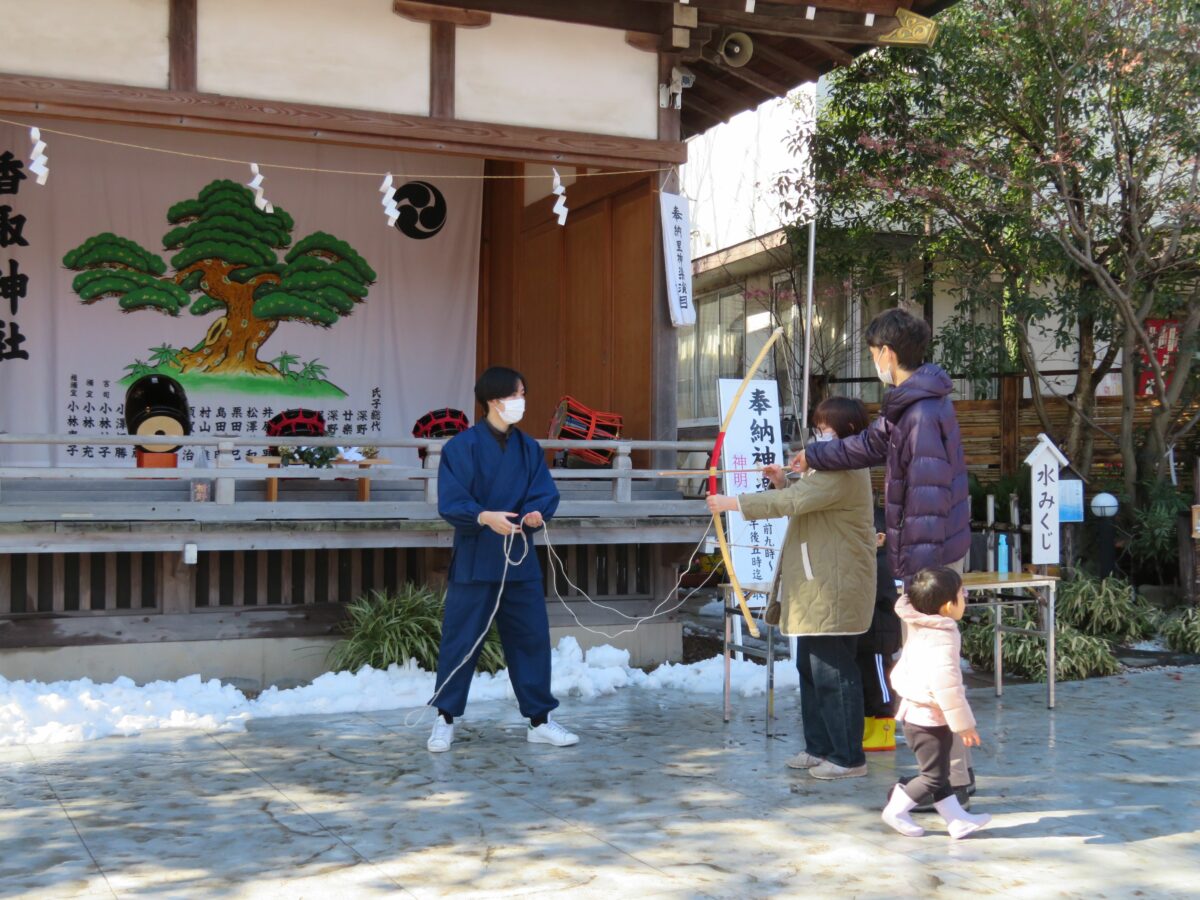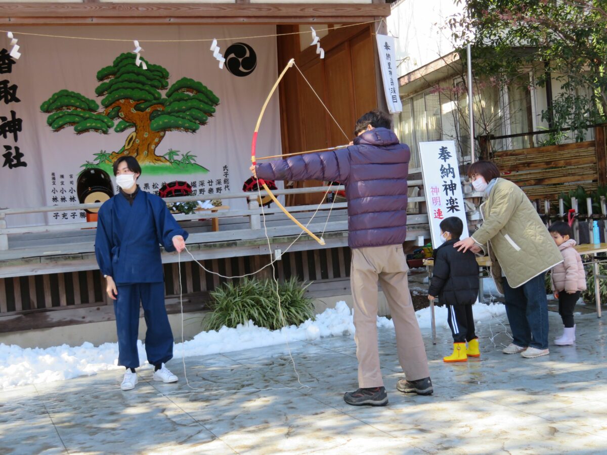 7歳の子どもが村社会に仲間入りすることを記念する意味もこめられるためか、香取神社では親子を問わずファミリーで的射を行うことができます。