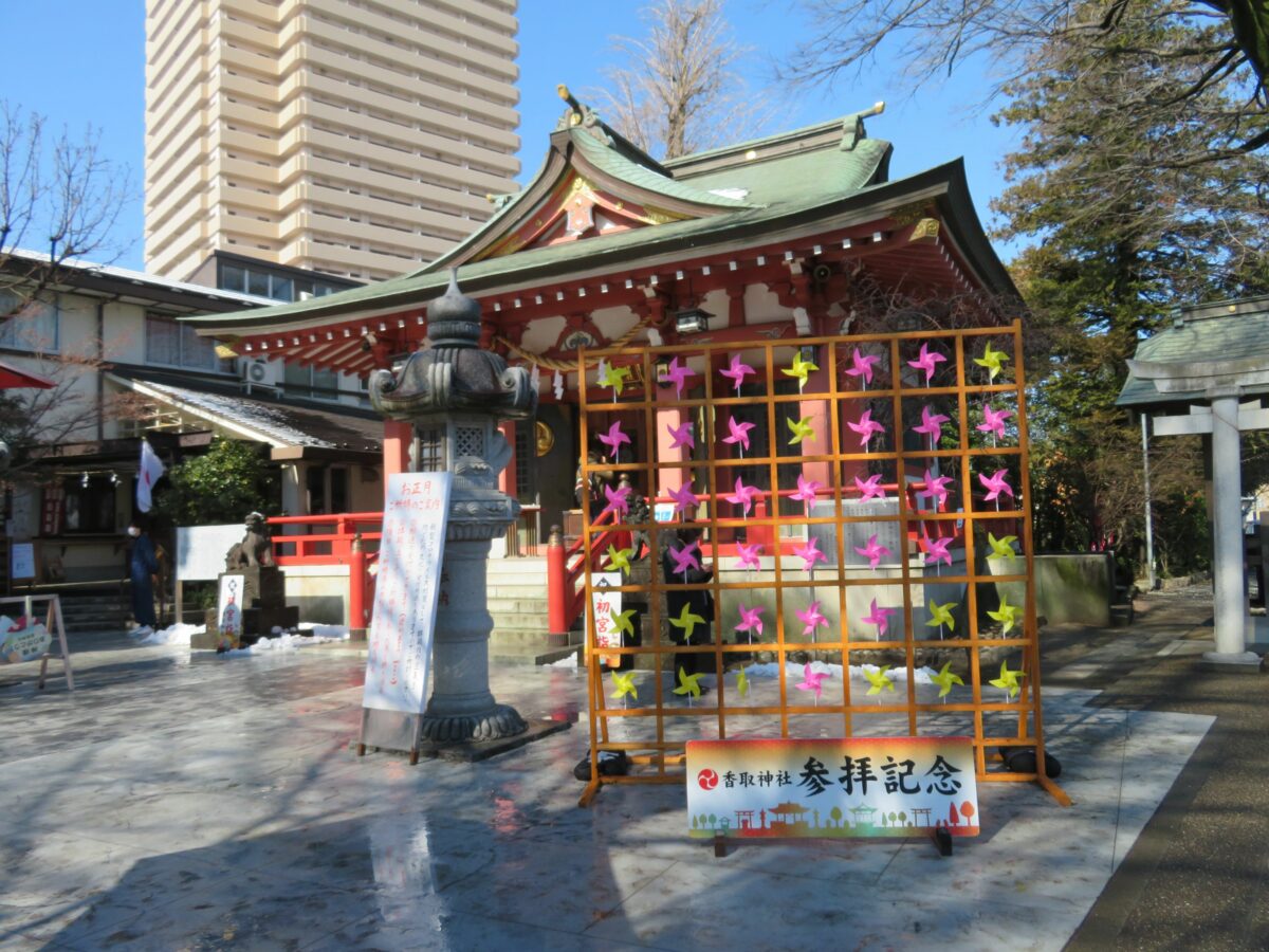 香取神社の創立は明らかではありませんが、室町時代の応永年間と推定されています。鮮やかな朱色の拝殿は戦後に、北に繋がる奥殿は1866年に再建されたものです。