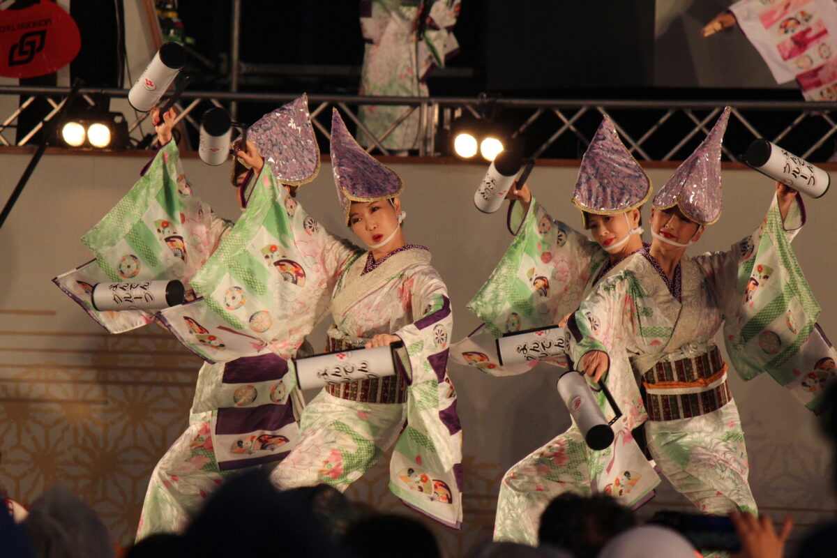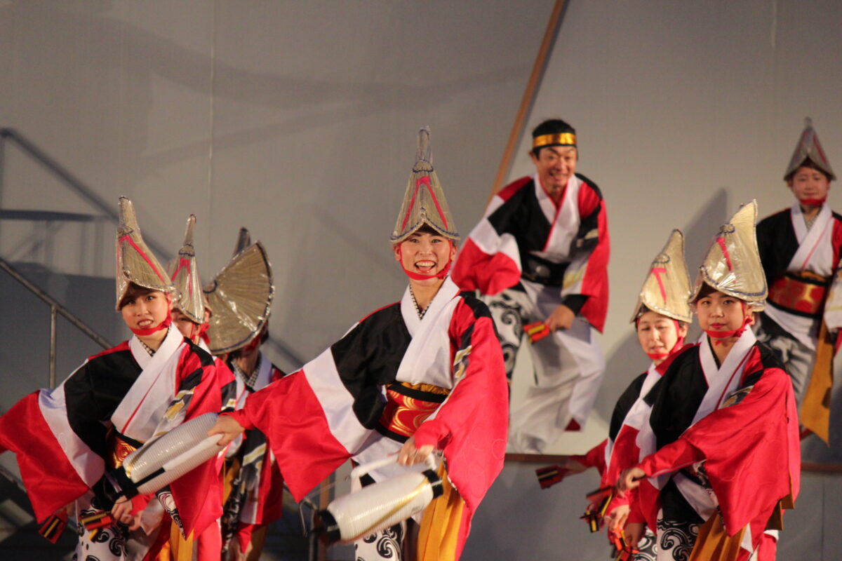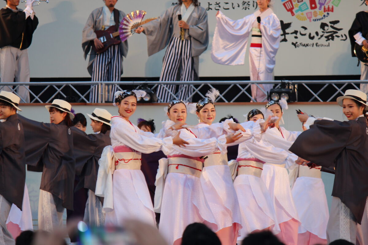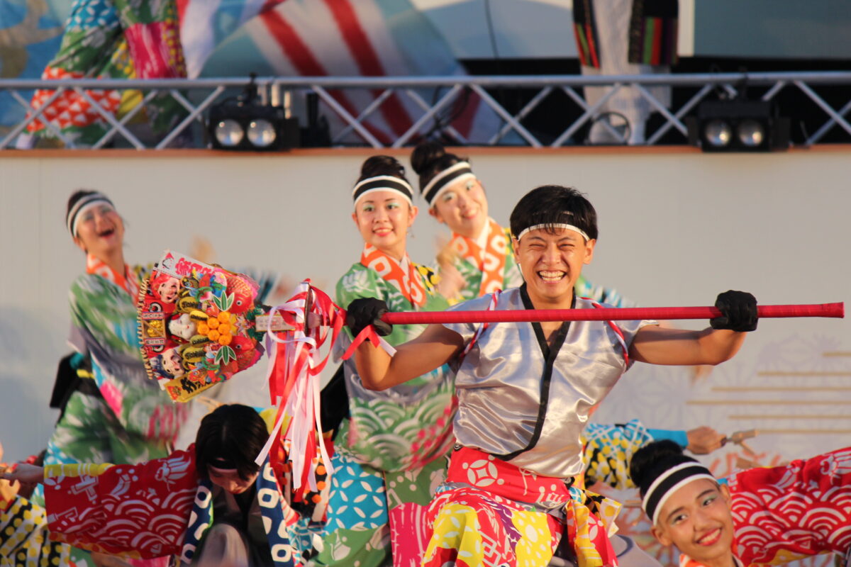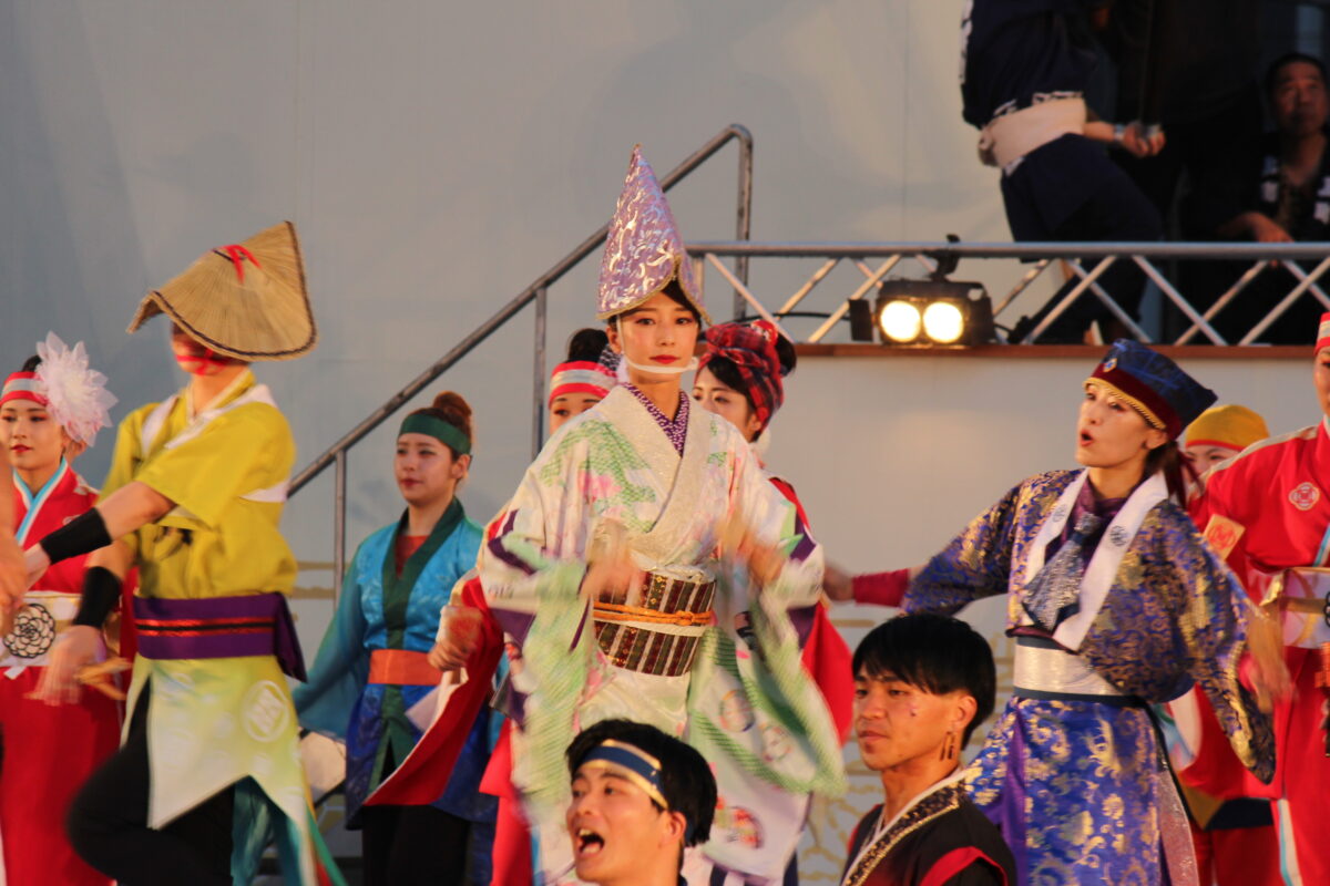 初日9日の前夜祭は神事をはじめ、前年のコンテストでの優勝チームが踊りを披露、そして、今年は台風で延期になってしまいましたが開幕を祝う花火大会が行われます。10日・11日は本祭で、登録する全チームが出場し、市内各所で演舞します。そして最終日12日の後夜祭の「よさこい全国大会」では全国各地のチームが踊りを競い合い、大賞ほか各賞が贈られるのです。