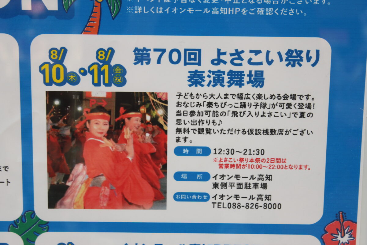 車を利用した僕は、高速を降りて高知市秦南町のイオンモール高知へ。こちらの商業施設では、なんと8月9日〜12日のよさこい期間中、駐車場が無料開放されています。