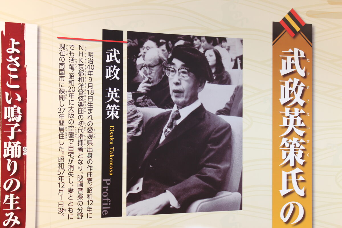 1954(昭和29)年、第1回よさこい祭りに際して、作曲家・武政英策氏がこの民謡を元に「鳴子よさこい踊り」の曲を制作。武政氏はのちに自身の持つ曲の著作権をオープンにします。現在では、この曲のフレーズをどこかに織り込むというルールのもと自由なアレンジが許されていて、各チームごとにサンバ調、ロック調にヒップホップ調など多彩な楽曲で踊っています。
