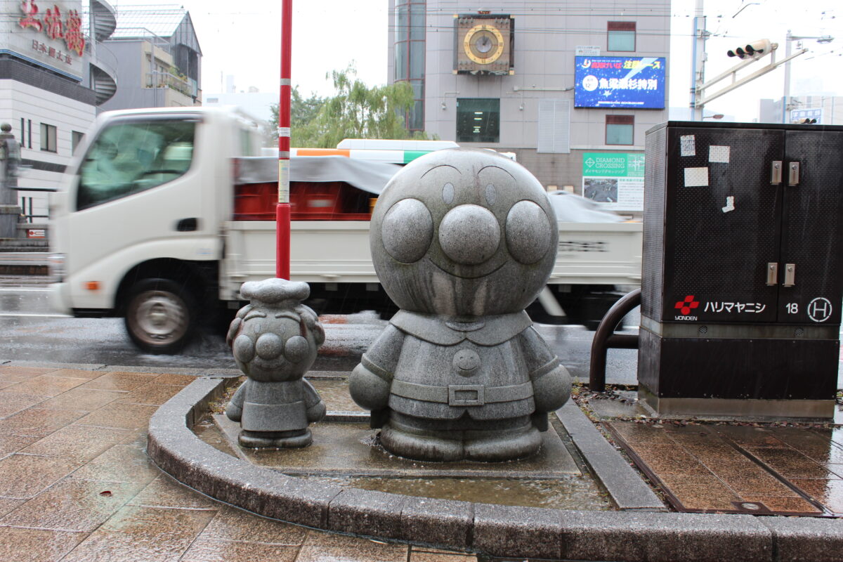 「よさこい節」にも歌われた「はりまや橋」は、同名の路面電車駅からすぐです。橋の近くにはアンパンマンも立っています。高知県は漫画家やなせたかしさんの出身地なのです。道路向かい側にはばいきんまんもいますのでお見逃しなく。
