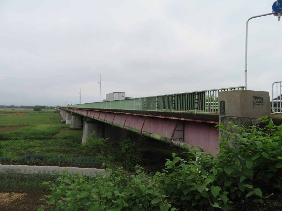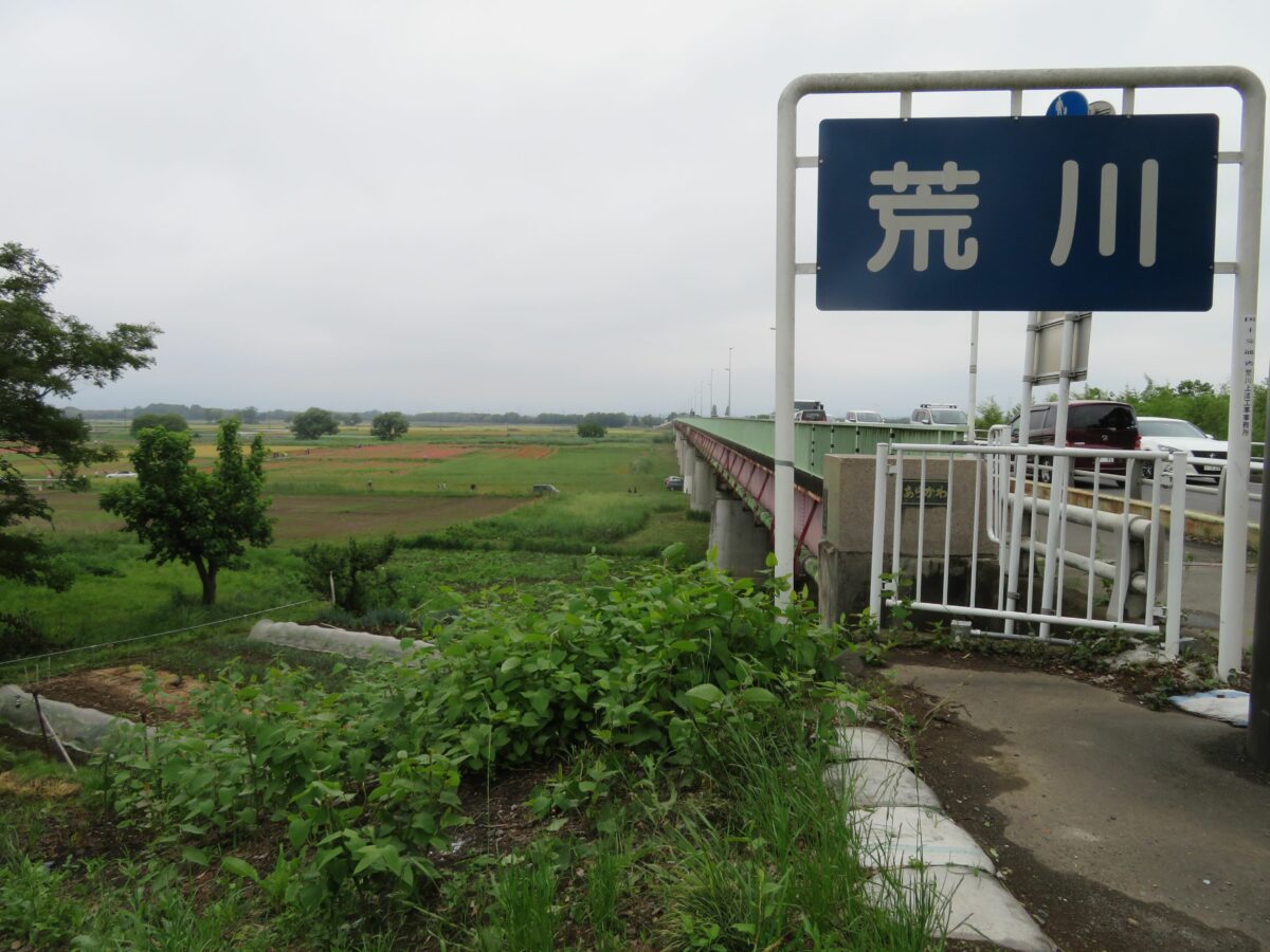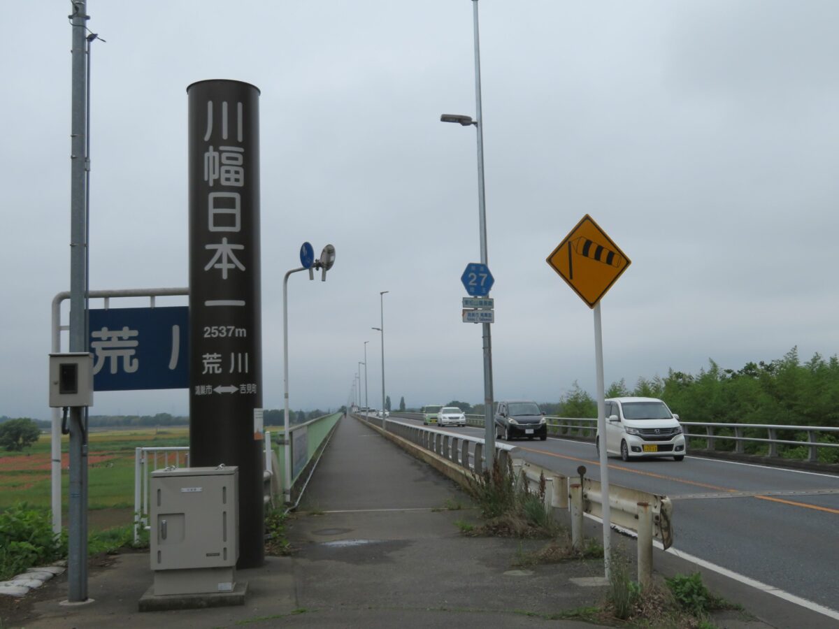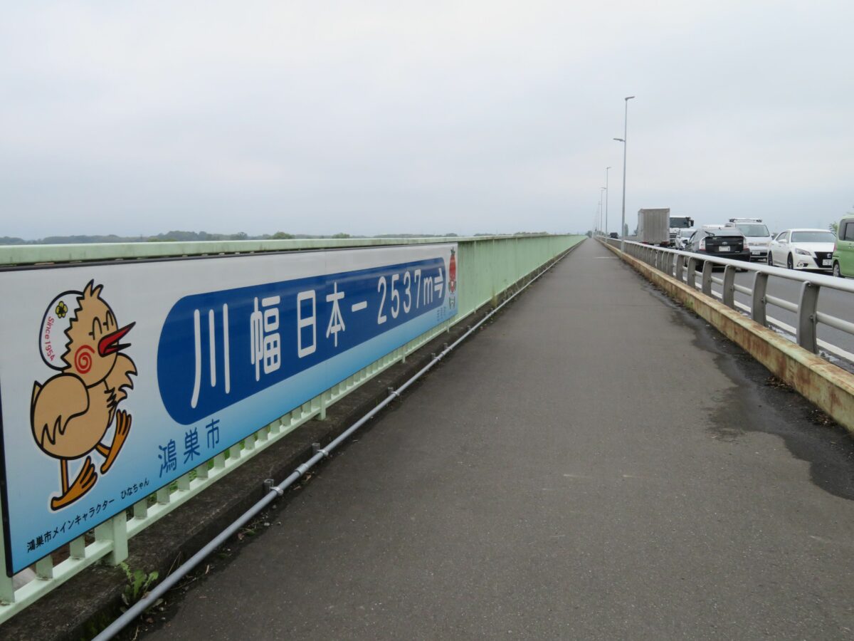 鴻巣市と吉見町の間に架かる御成橋の袂に立つ「川幅日本一」の案内板