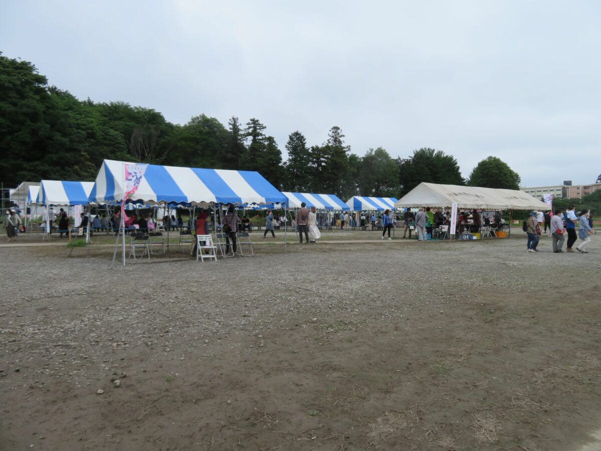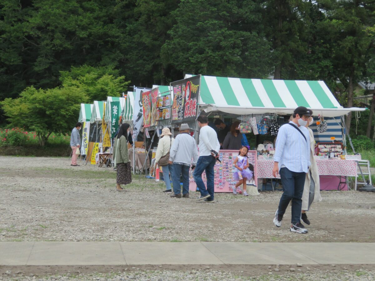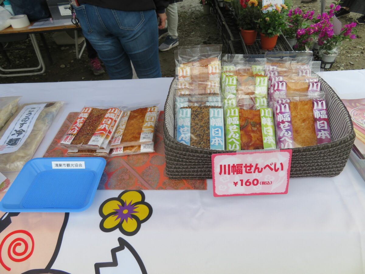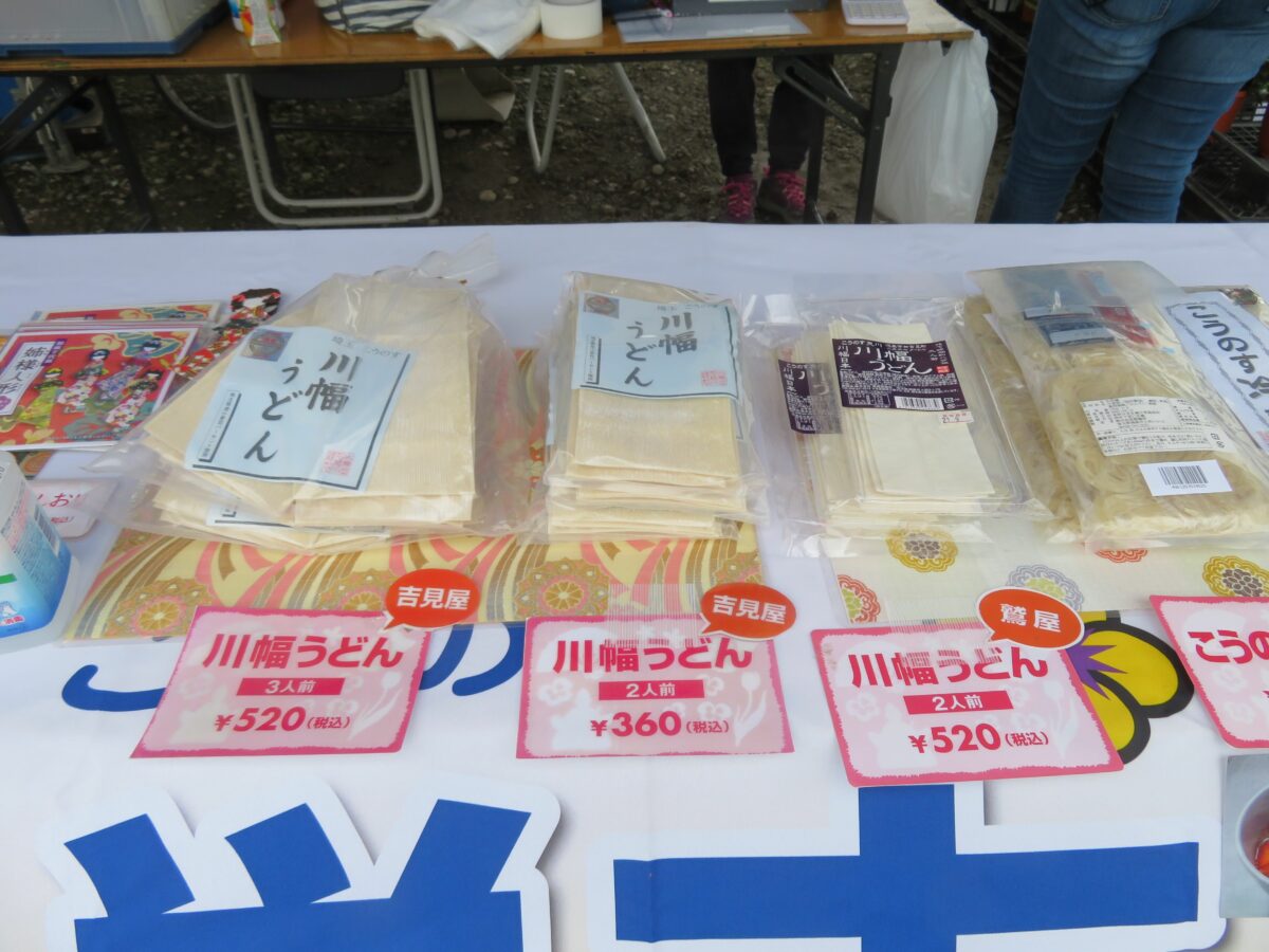 イベント広場を囲む露店では、「川幅日本一」の鴻巣市で産まれた「川幅うどん」や「川幅せんべい」などが販売されています。「川幅うどん」は麺の幅が数センチ以上の平たいうどんで、鴻巣市のご当地グルメとして定着し市内のうどん屋では麺の幅を競っています。