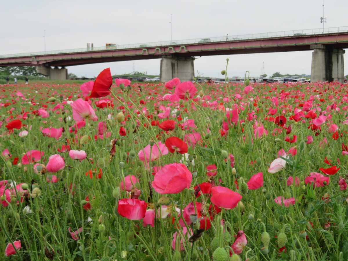 秩父から関東平野を流れる荒川は、埼玉県の鴻巣市で「川幅日本一」となります。鴻巣市と吉見町を繋ぐ御成橋から南にはポピー・ハッピースクエアが整備され、3000万前後のポピーが植栽されています。例年5月中旬から下旬には広大な河川敷が豊かに彩られ、「鴻巣ポピーまつり」が開催されています。