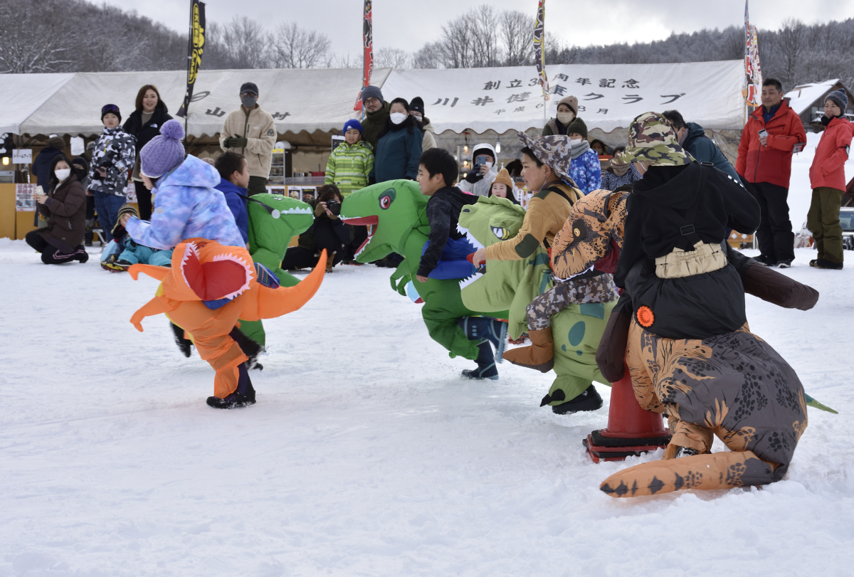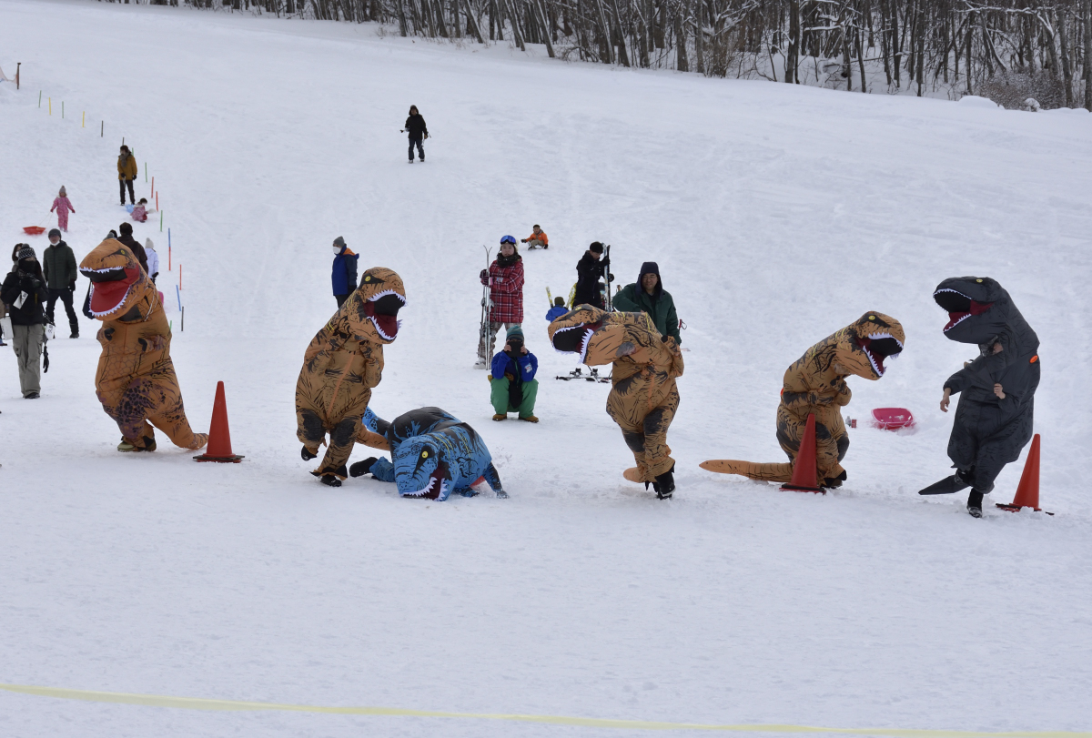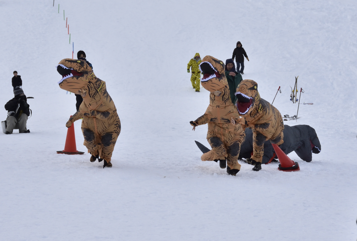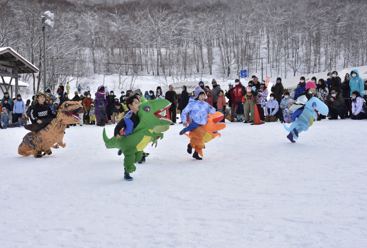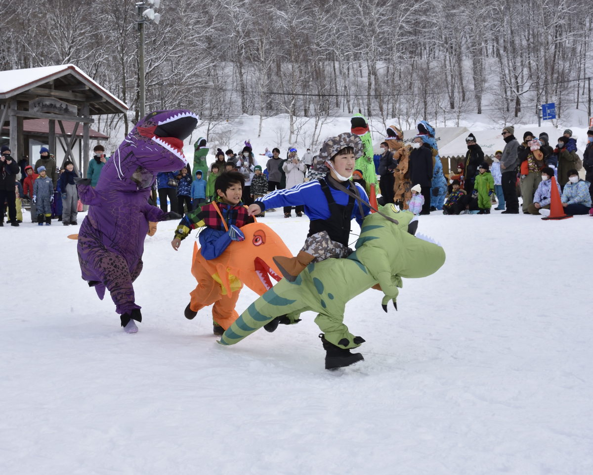 レースは小学生以下の子供の部と、中学生以上の部に分かれており、子供の部では上半身が露出した着ぐるみ、中学生以上は全身がすっぽり入るタイプの着ぐるみを被り、雪上を疾走します。
