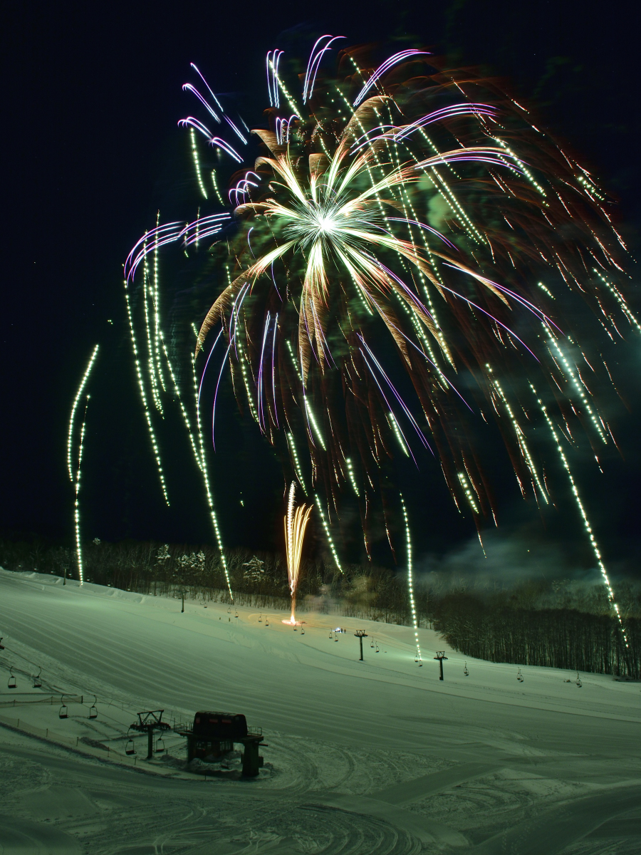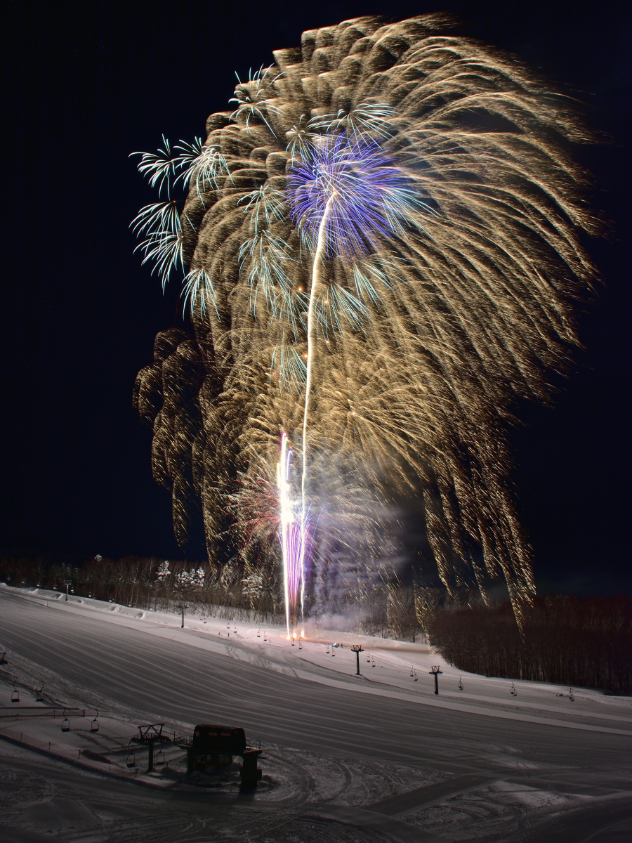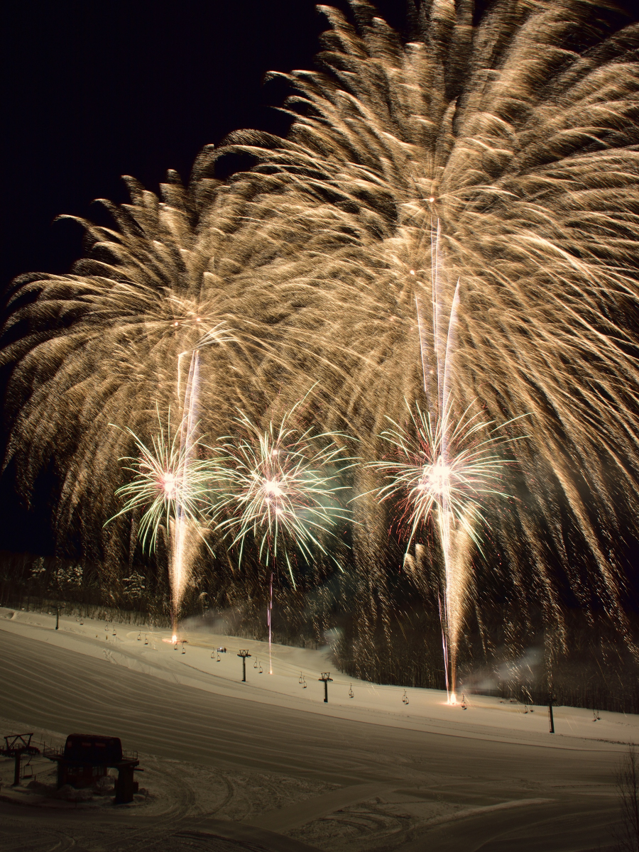 フィナーレは、2カ所からのワイド打ちになり、大きな金色の花火がゲレンデを包み込みました。