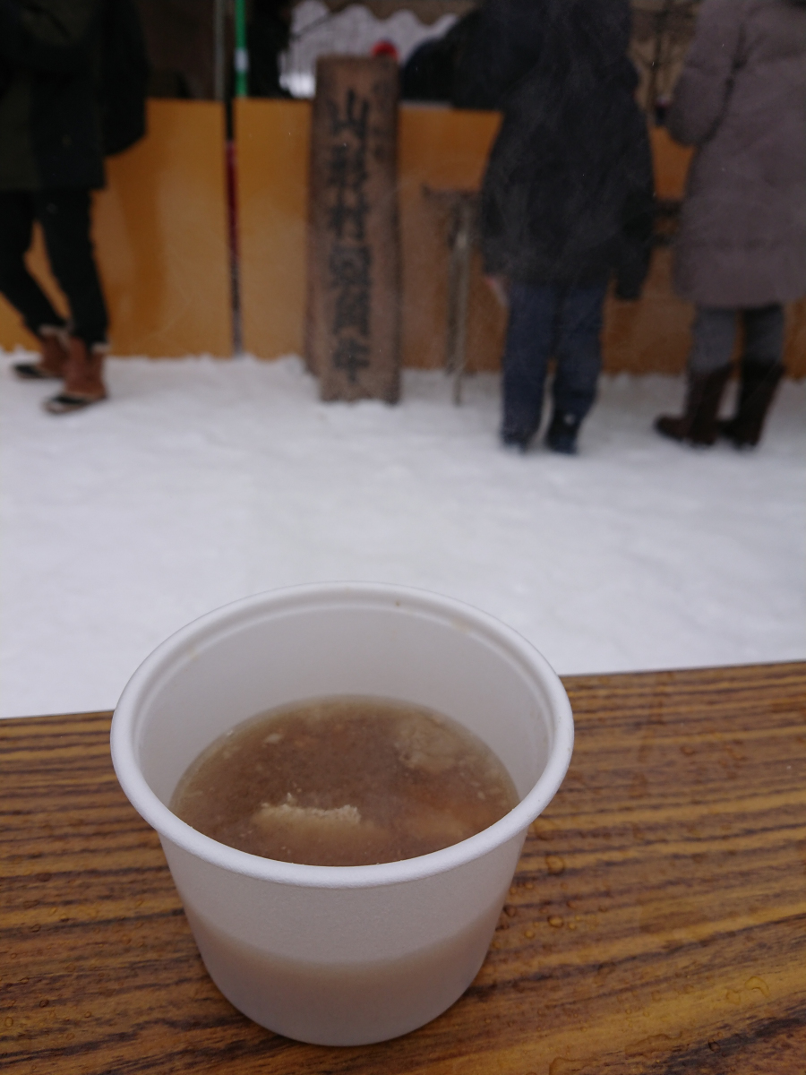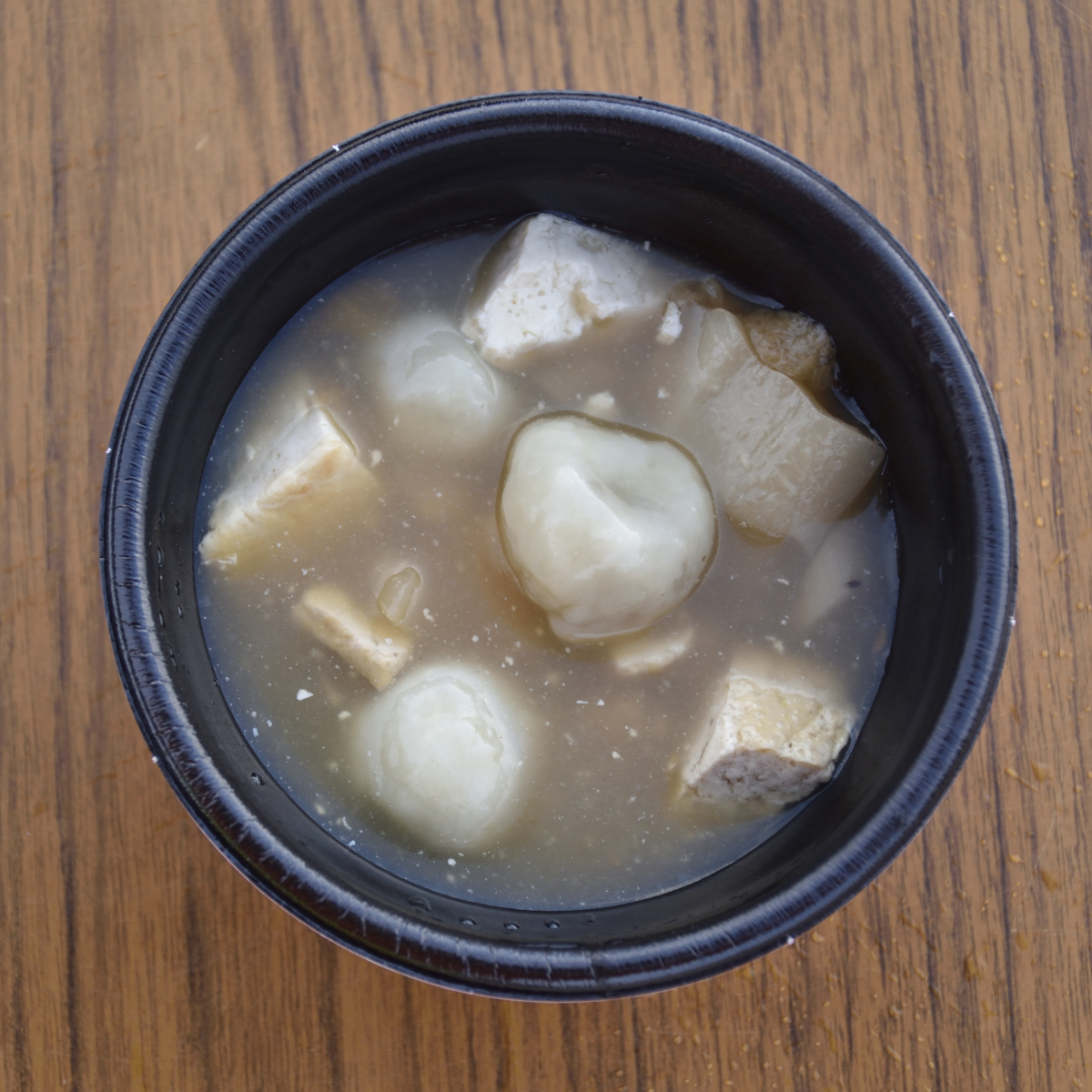 甘い団子が汁物に?!と驚きますが、甘さ控え目の団子と、薄めの味噌ベースの汁がうまく調和し、体に染み入る美味しさです。