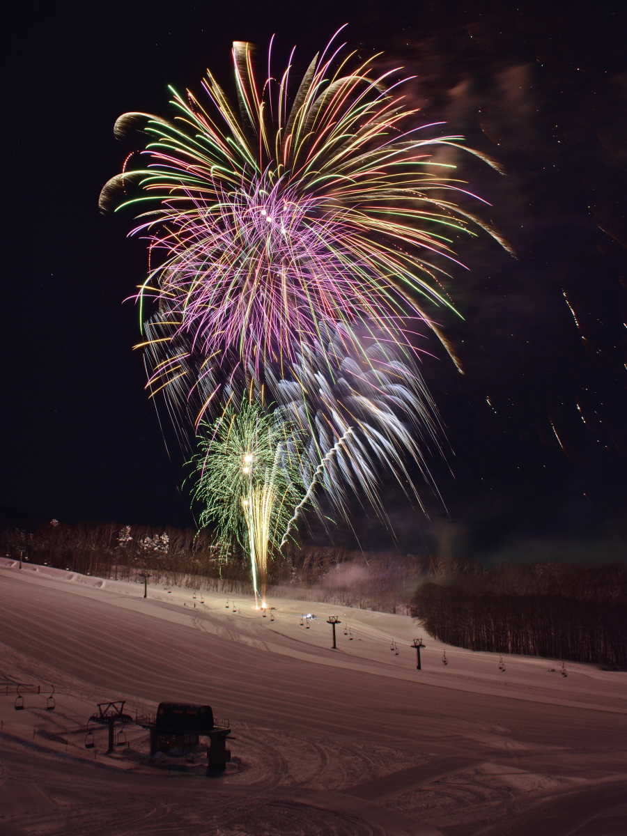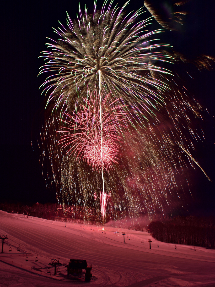 白銀のゲレンデを染める花火の色彩が美し過ぎます!