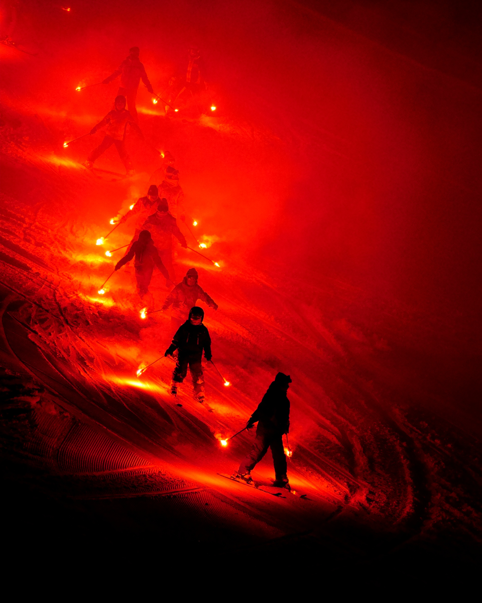 すっかり辺りが暗くなった18:00。たいまつ滑走が行われます。