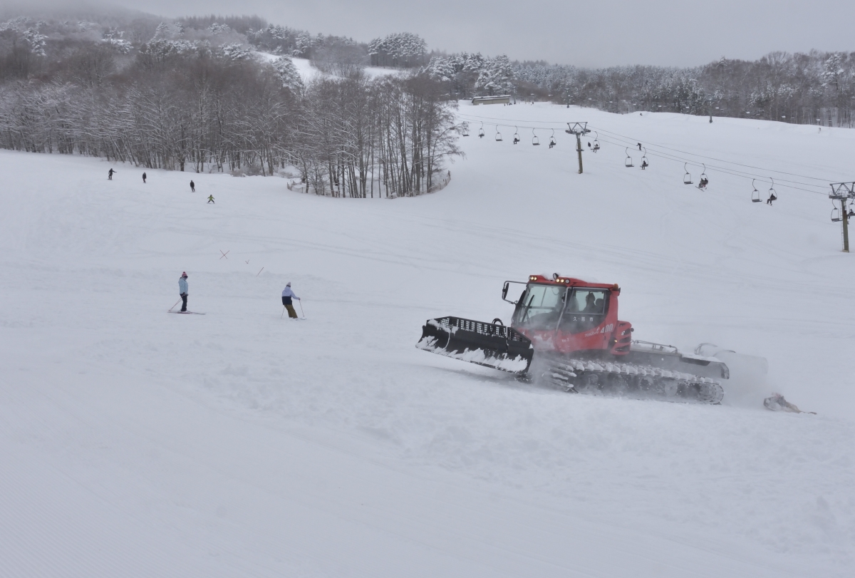 滑りやすいよう、まずはじめに圧雪車で斜面を馴らします。圧雪車の力走を間近で見られるのも楽しいです。