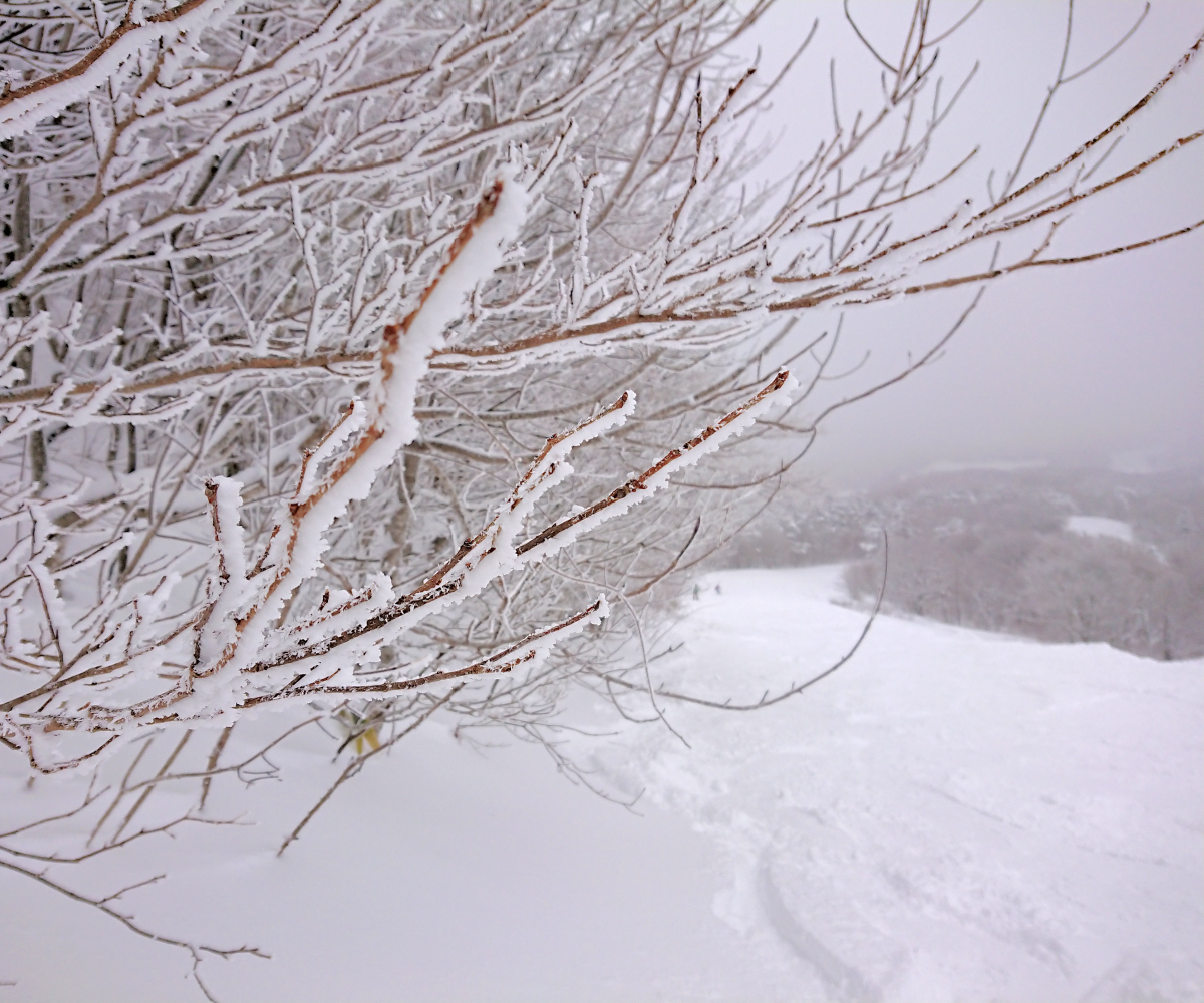 尾根にあるリフト頂上付近では、空気中の水分が木々に凍り付く「霧氷(むひょう)」が見られ、清涼な美しさに心惹かれます。