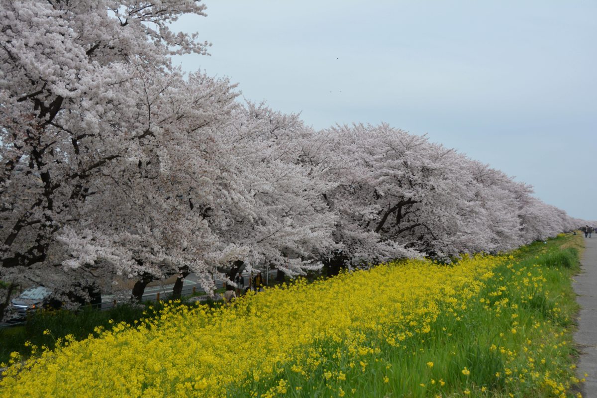 熊谷桜堤の石碑から西に約1キロのところに荒川大橋が架かっています。この橋の桜並木の西端となります。荒川大橋の袂には菜の花が育ち、桜の開花に合わせるように黄色の花を咲かせます。桜の薄紅色と菜の花の黄色が、温かな雰囲気を漂わせながら溶け合っています。