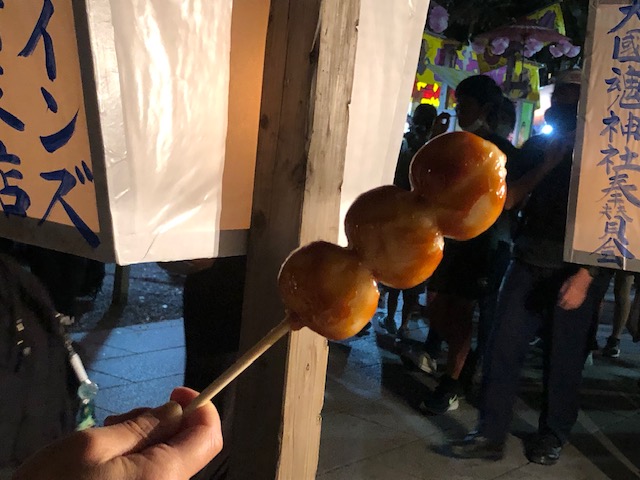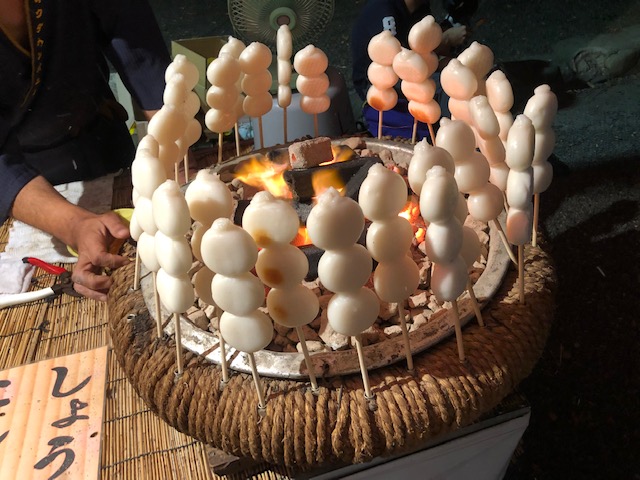 続いて、餅が焼かれている様子に惹かれて、串焼き団子を。こちらも味付けが選べます。田楽みそにも心惹かれながらも、王道のみたらしにしてみました。