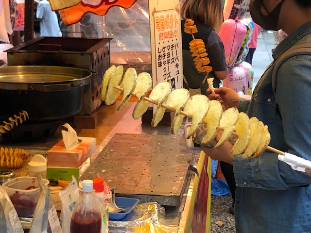 どんなものなのか並んでみました。くるくるしたジャガイモが串に刺さっています。味付けも選べるとのこと。先に並んでいる中学生くらいの女の子を参考に、塩味にしてみました。なるほどいただいてみると、ポテトチップスみたいな味わい。串にささっていて食べやすく、映える要素もあることでの人気なのでしょうか。