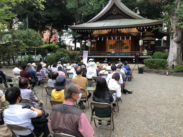 その数70席ほど。江戸の里神楽山本頼信社中による奉納神楽が、午後5時と午後7時に行われると看板に記されてています。午後4時ごろから徐々に席がうまりはじめ、開始10分前くらいにはほぼ満席の状態になりました。