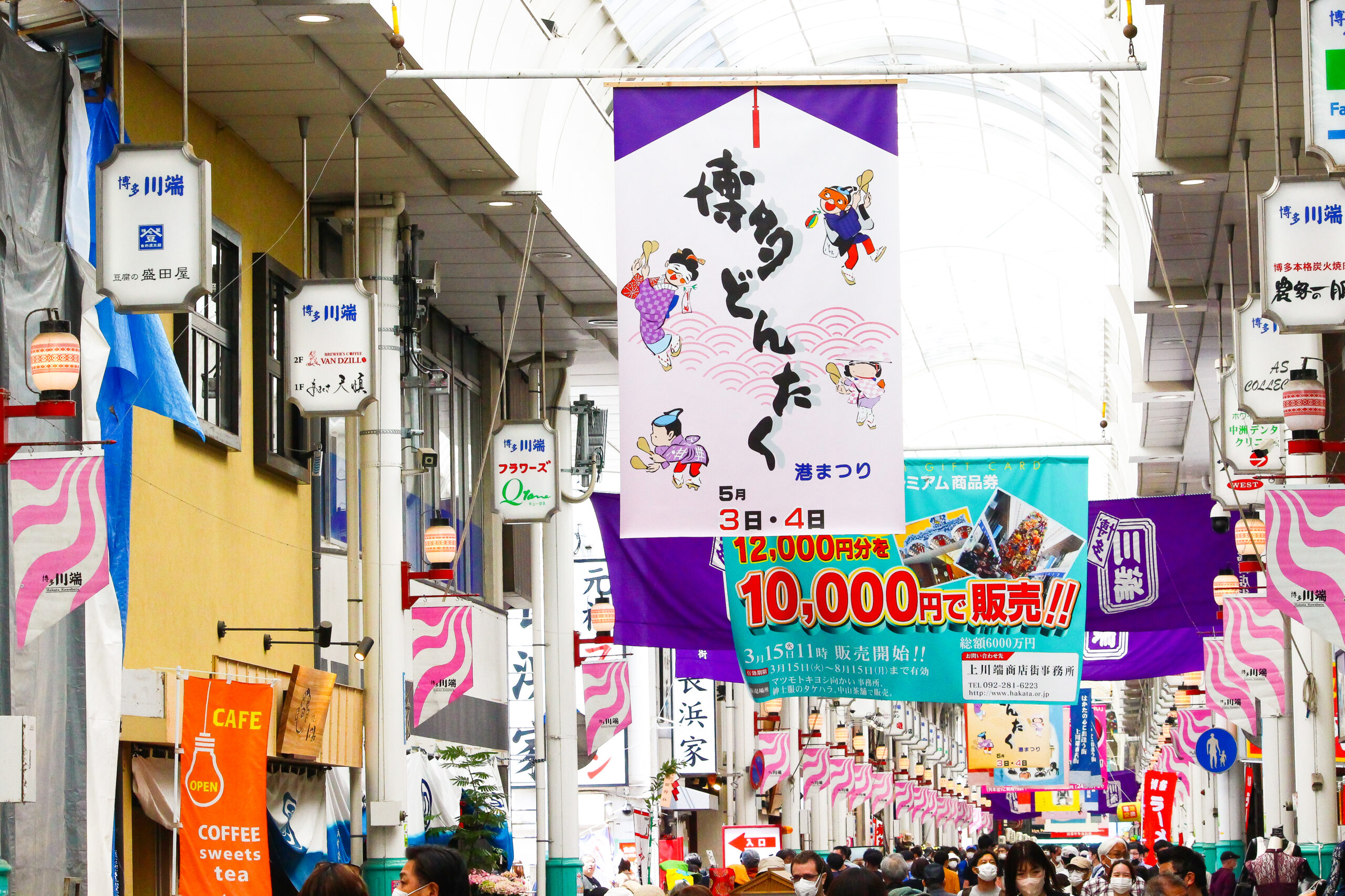 境内の南神門を抜けると、すぐに現れる川端通商店街。こちらも期間中は博多どんたくの横断幕が掲げられ、お祭りの雰囲気を味わえます!