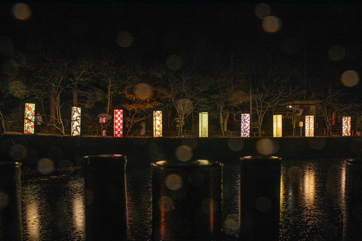 小倉池の雨の日撮影はキラキラと雨粒が写り、晴れの日は鏡のように美しくリフレクションした巨大行灯が写ります。