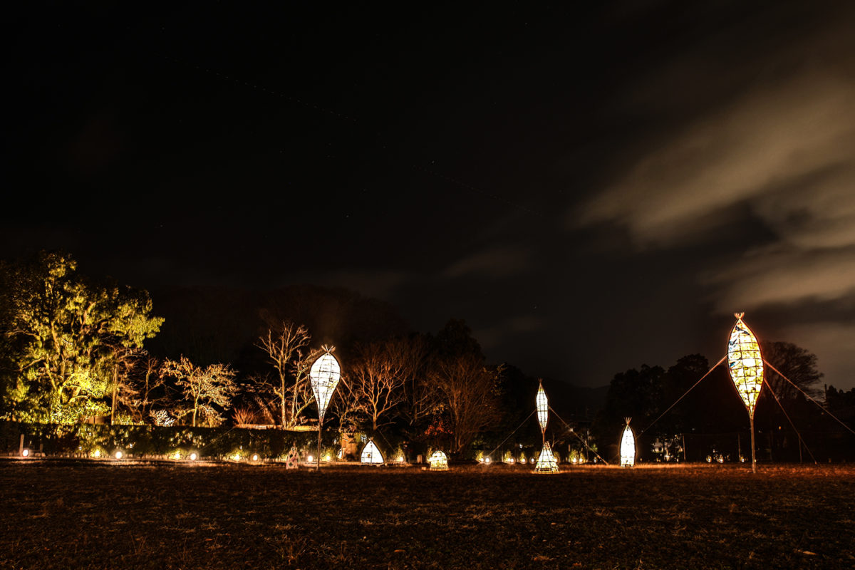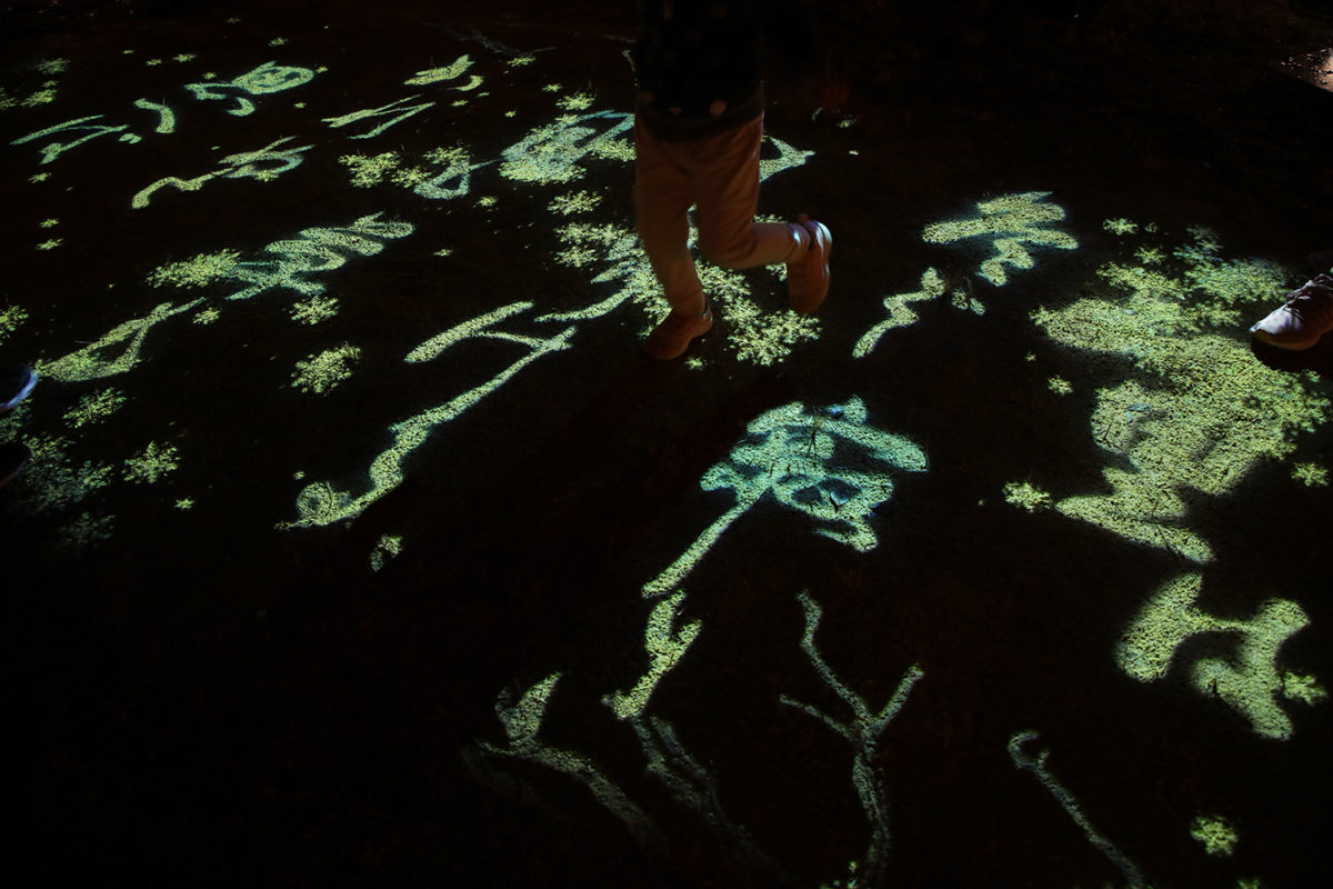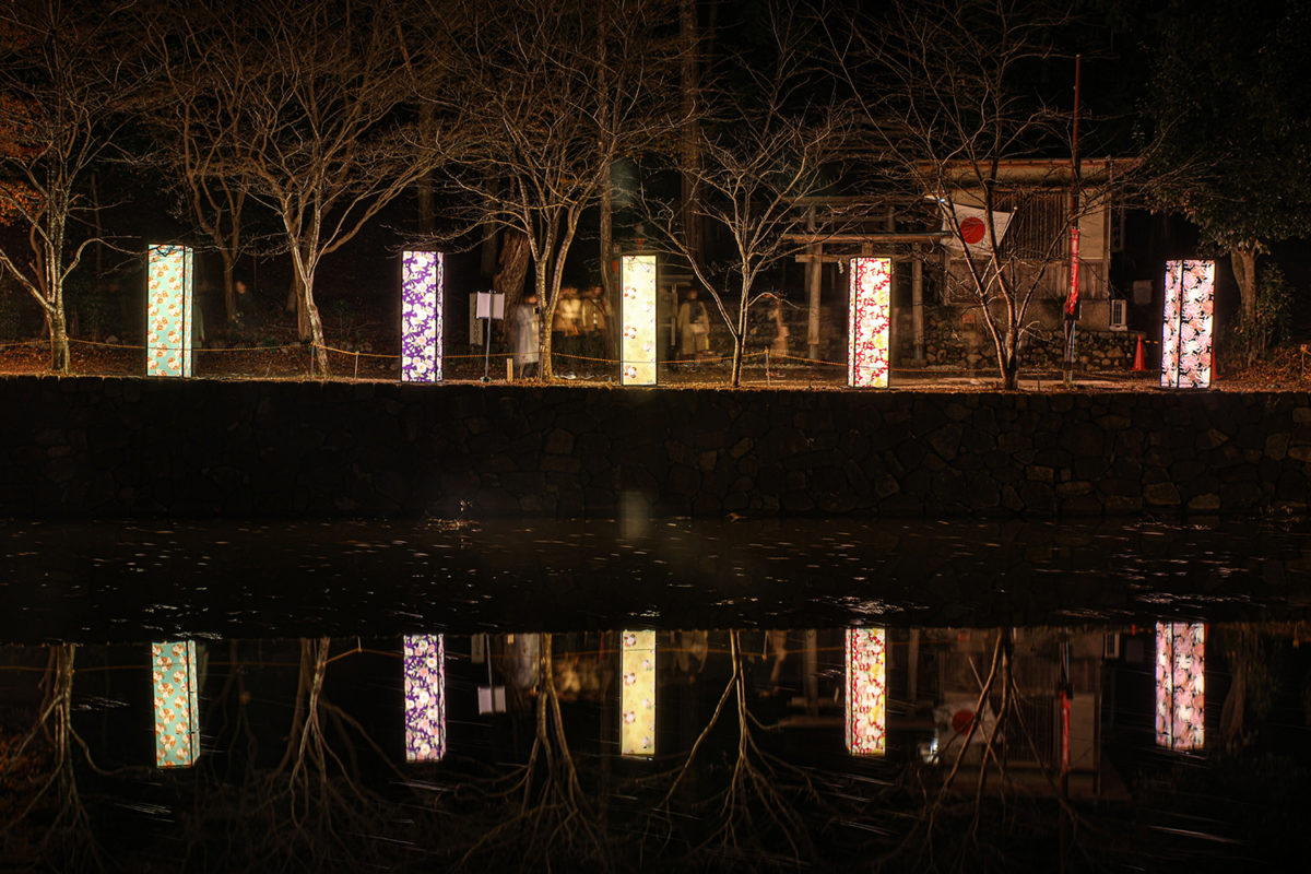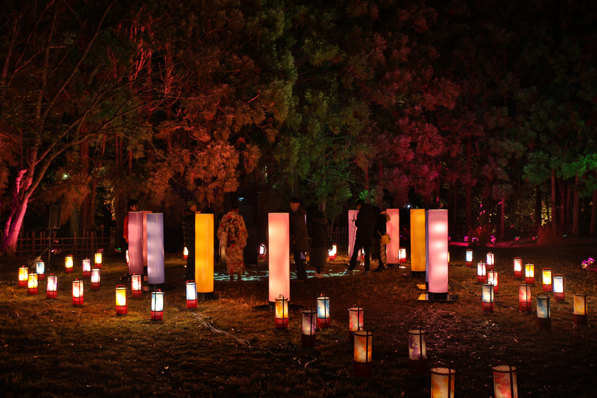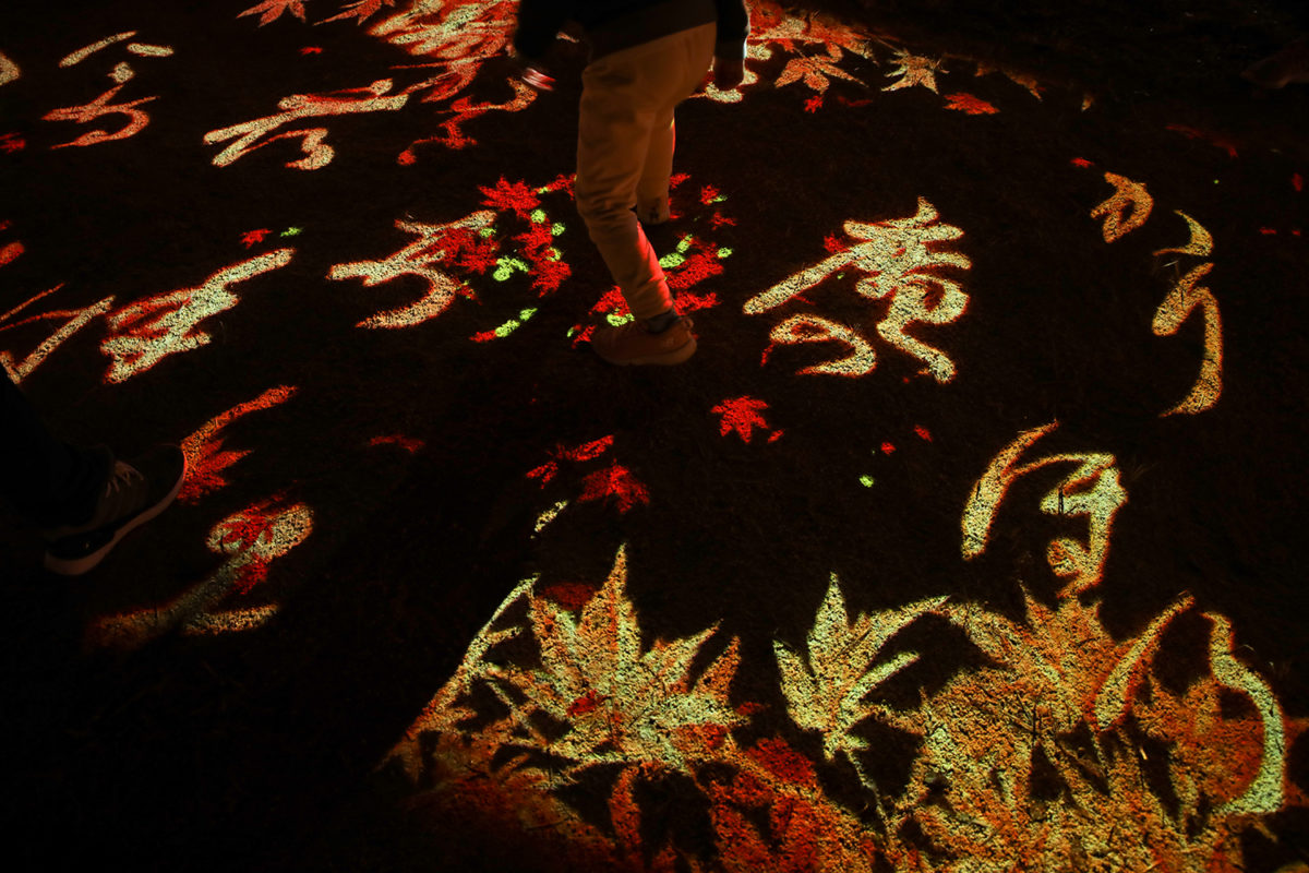 歌詠みの社の近くに来ると心地よい香りが漂います。癒しの香りに誘われて進んで行くと足元に灯りで描かれた四季の移ろいが現れます。