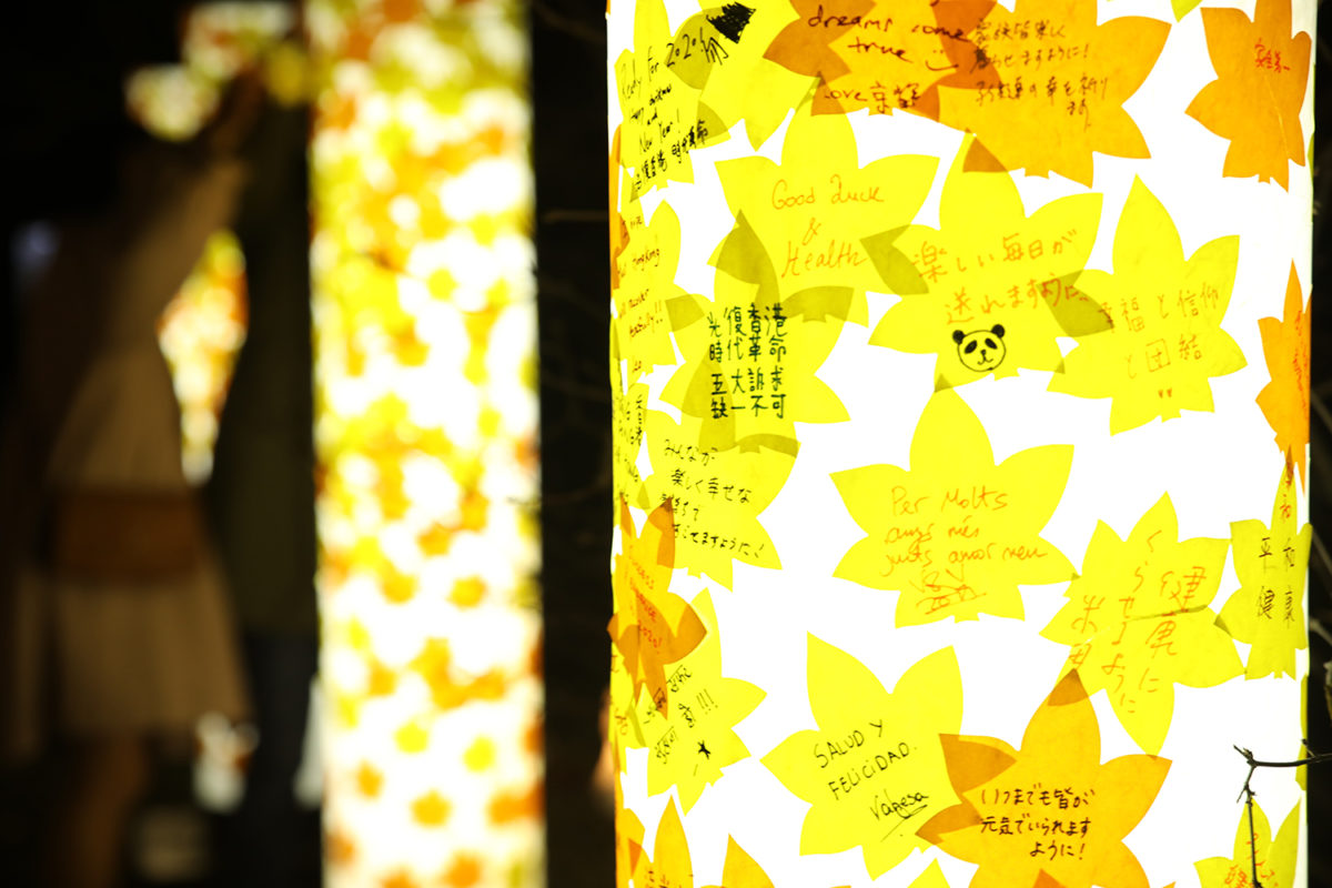 世界各国の言葉で願い事をたくした紅葉で彩られた巨大行灯が飾られています。