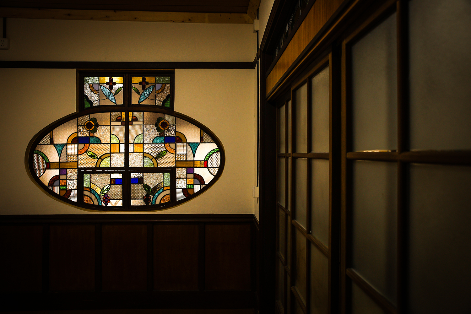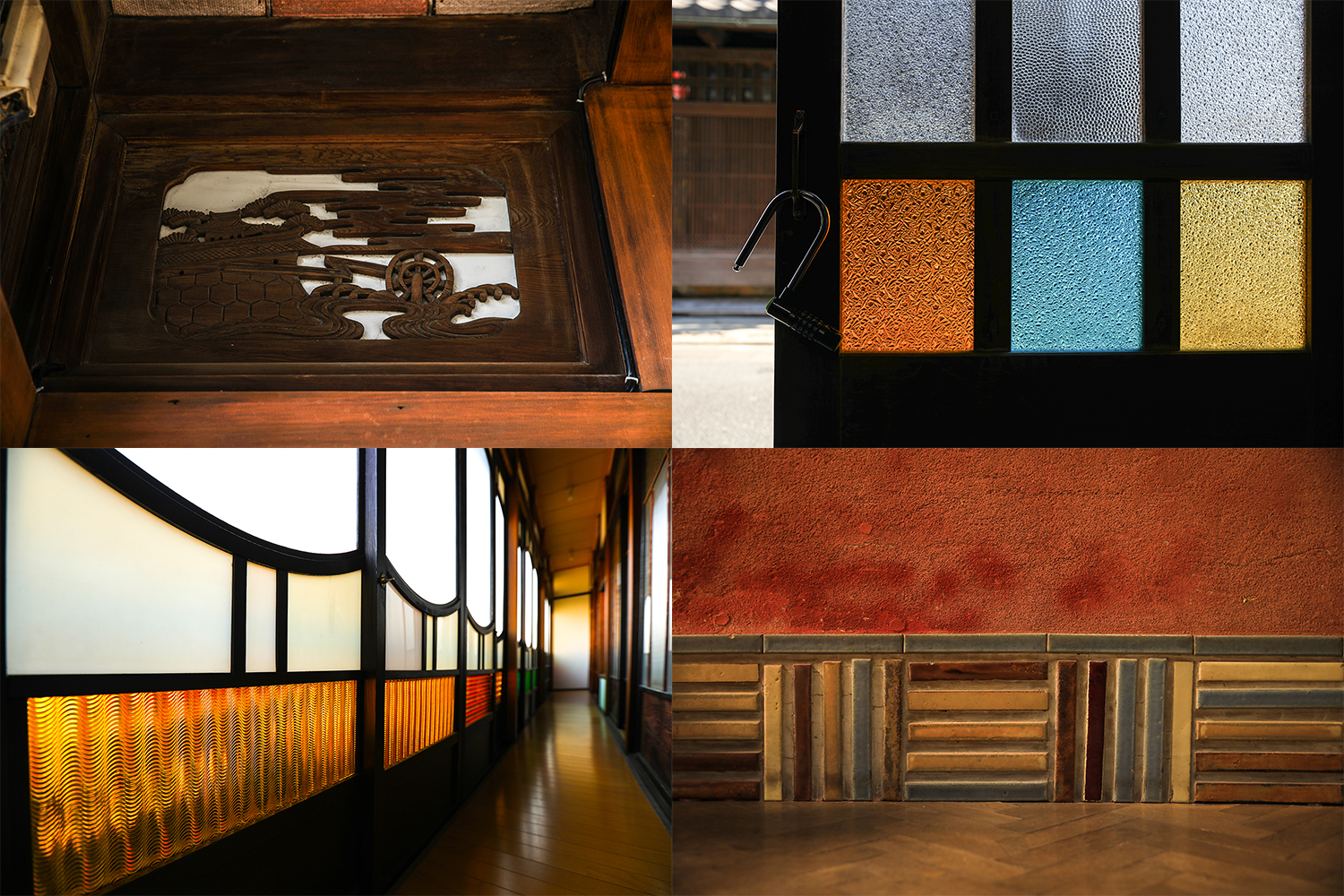 橋本駅から西側に少し歩くと、京都市内で見るシンプルな美しさの京町家とは違う、装飾が施された古い建物があちこちに立っています。窓にはステンドグラスや欄間、壁や床には近代美術工芸の「泰山タイル」と華やかな場所であった痕跡がみてとれます。