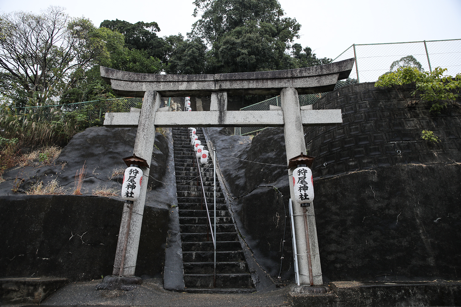 現在では地元の人は「プリン山」と呼ぶ小高い山の上に狩尾神社があります。
