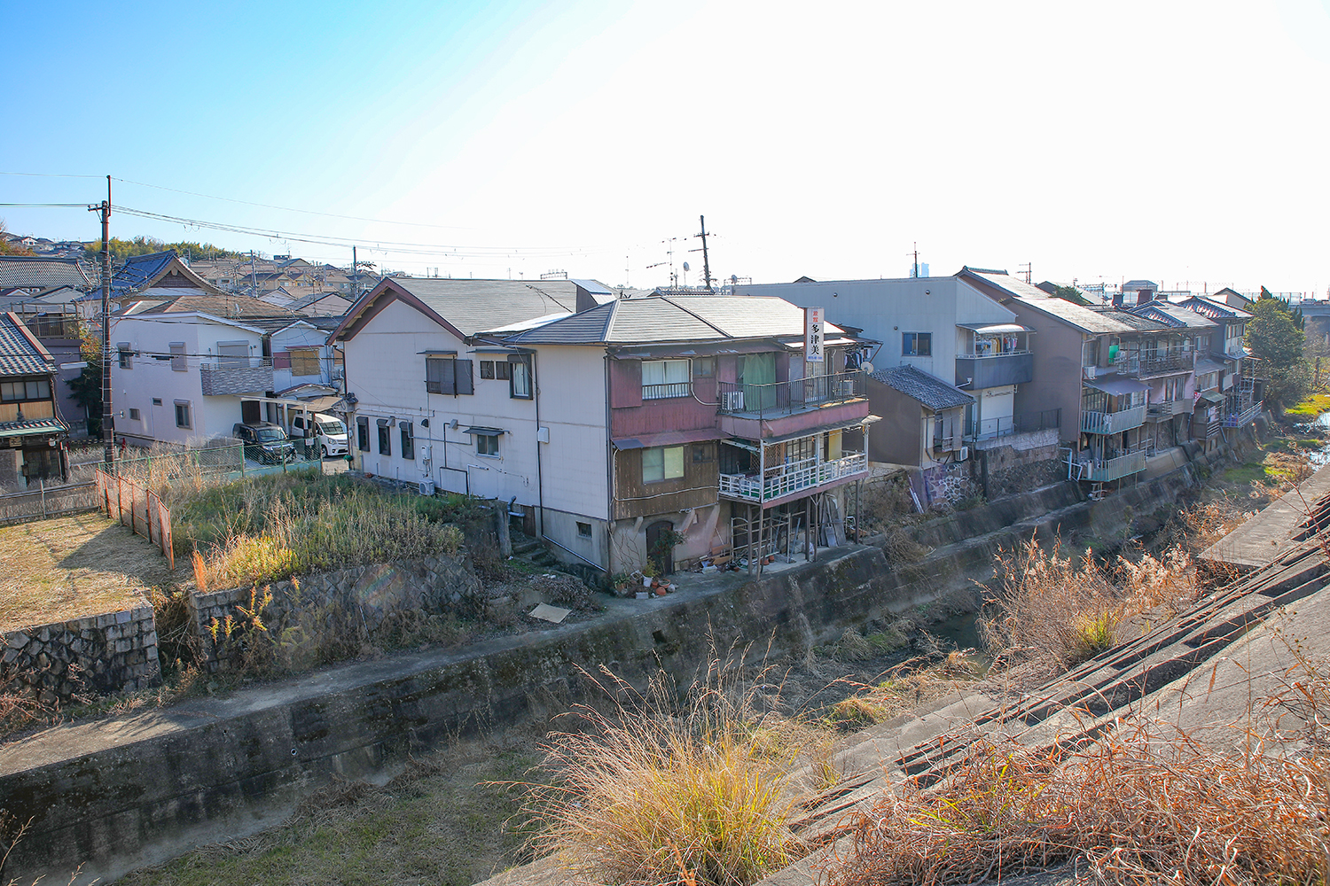 橋本駅の西側は不夜城であった楼閣が残るエリア。東側は山の斜面にびっしりと家が立ち並んでいます。橋本の隣の樟葉(くずは)駅からは大阪で、ショッピングモールが立ち並ぶ都会です。