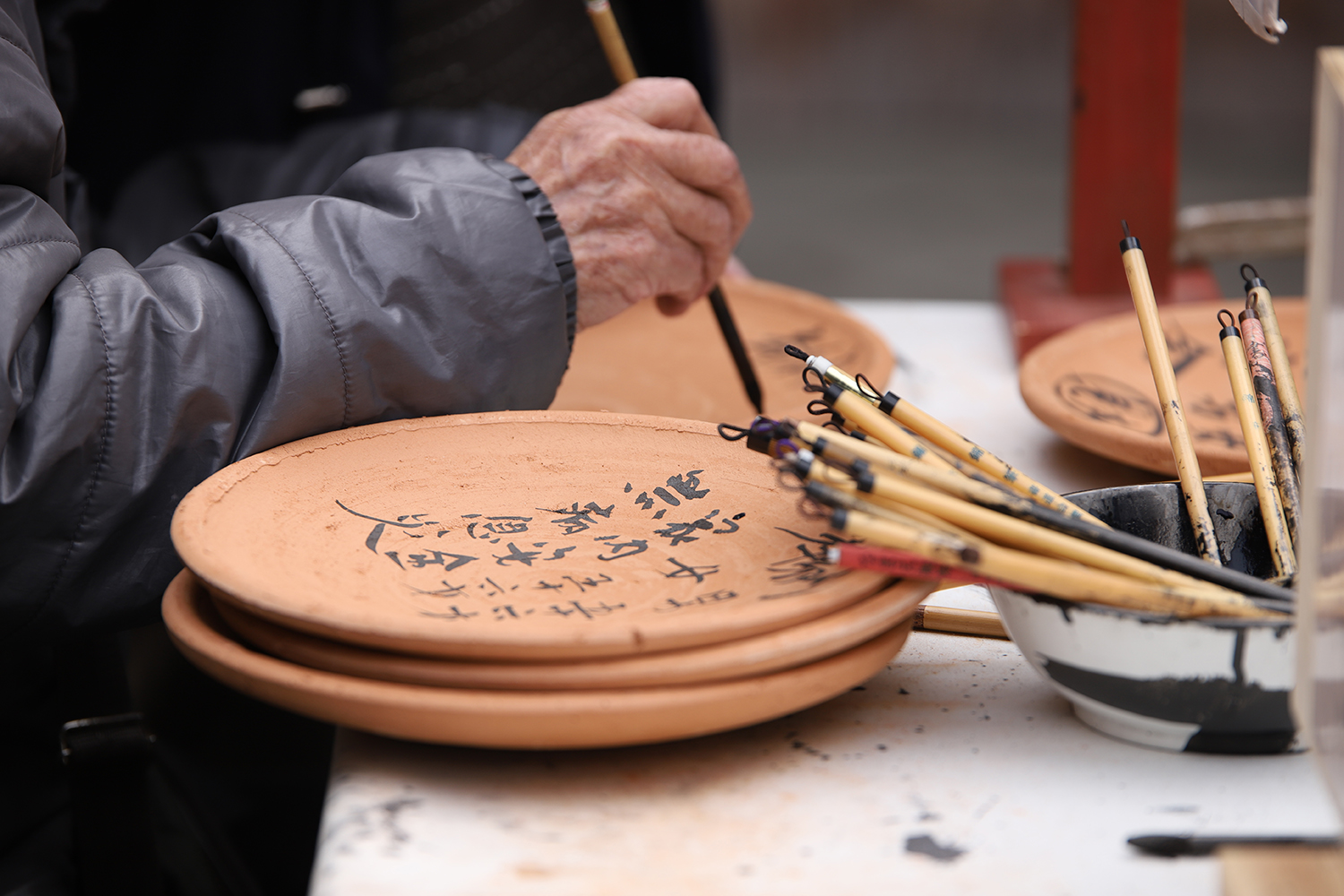 素焼きのお皿「焙烙(ほうらく)」に名前や願い事を書き、壬生狂言の序曲「炮烙割り」で割ってもらい災厄を払います。また演目「節分」は「まめに働くこと」で邪気が払われ福を招くという内容です。