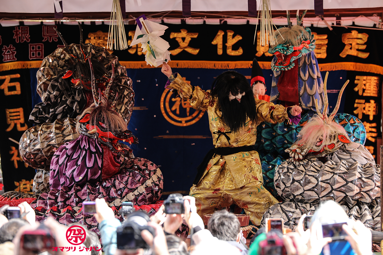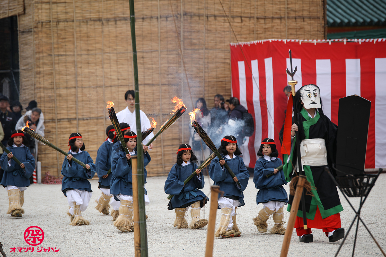 黄金の四つの目を持った方相氏(ほうそうし)が登場。最後には鬼の舞が披露されます。