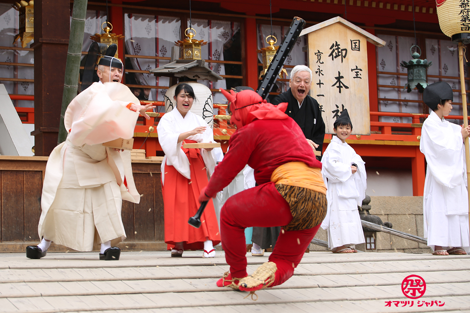 神職が「鬼やろう!」と叫び、豆まきが行われる。豆で退治されながらも何度も坂をのぼってくる鬼がだんだんフラフラしてくる姿が健気に見えてきます。