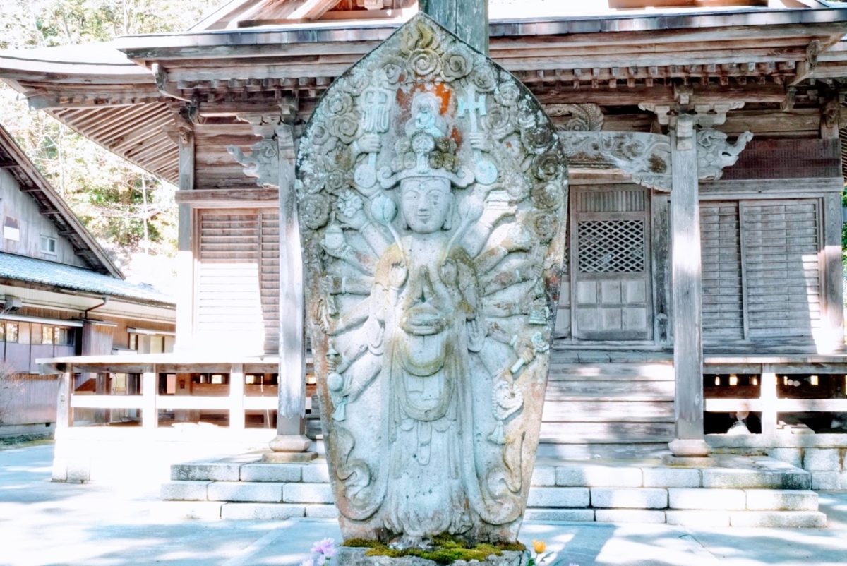 お堂の前に立つのが石仏の千手観音像。言い伝えでは、海中より漁網にかかってあげられたという(い、いやそれは流石に……)。鎌倉時代の技法が使われているらしいです。