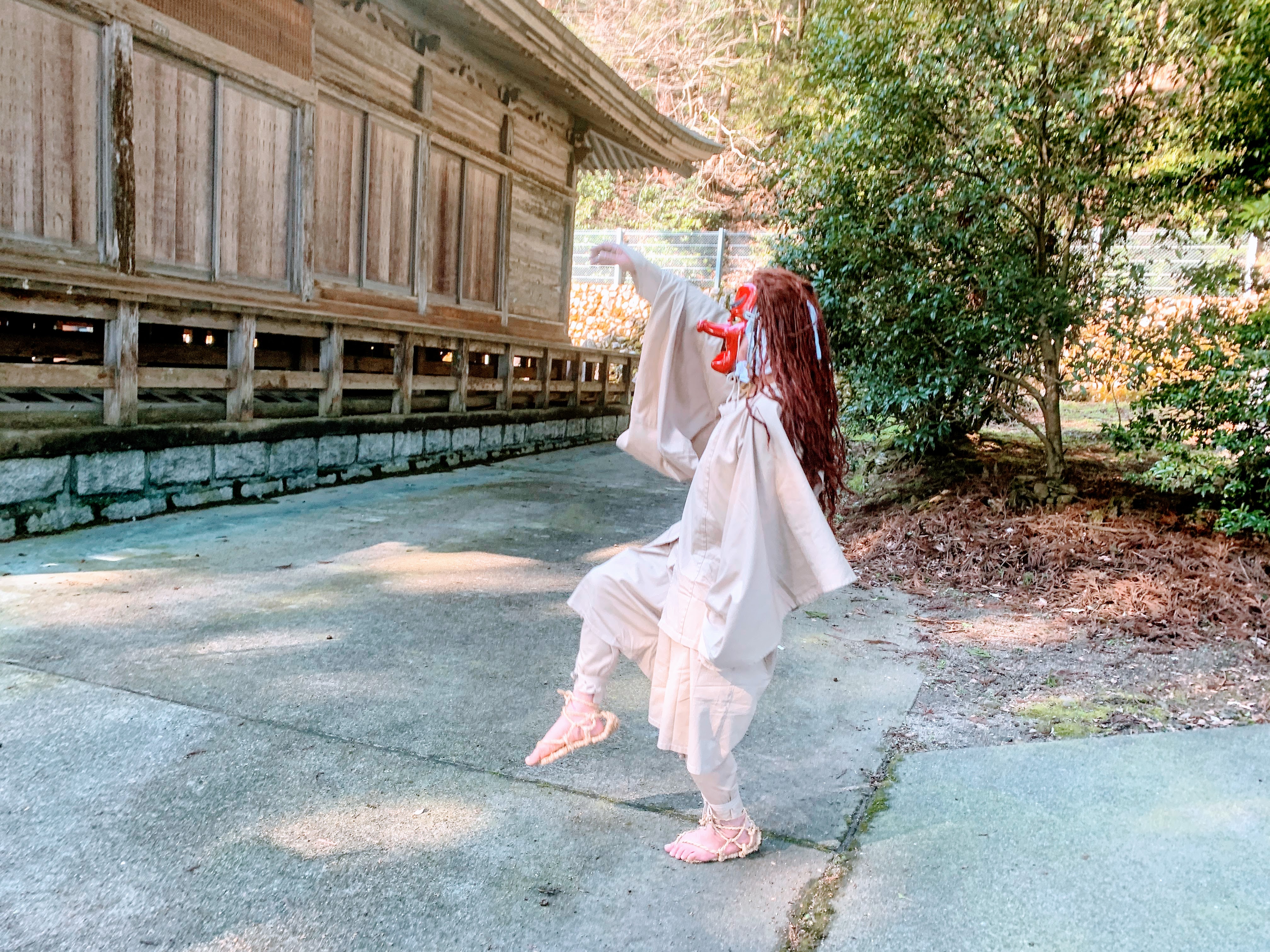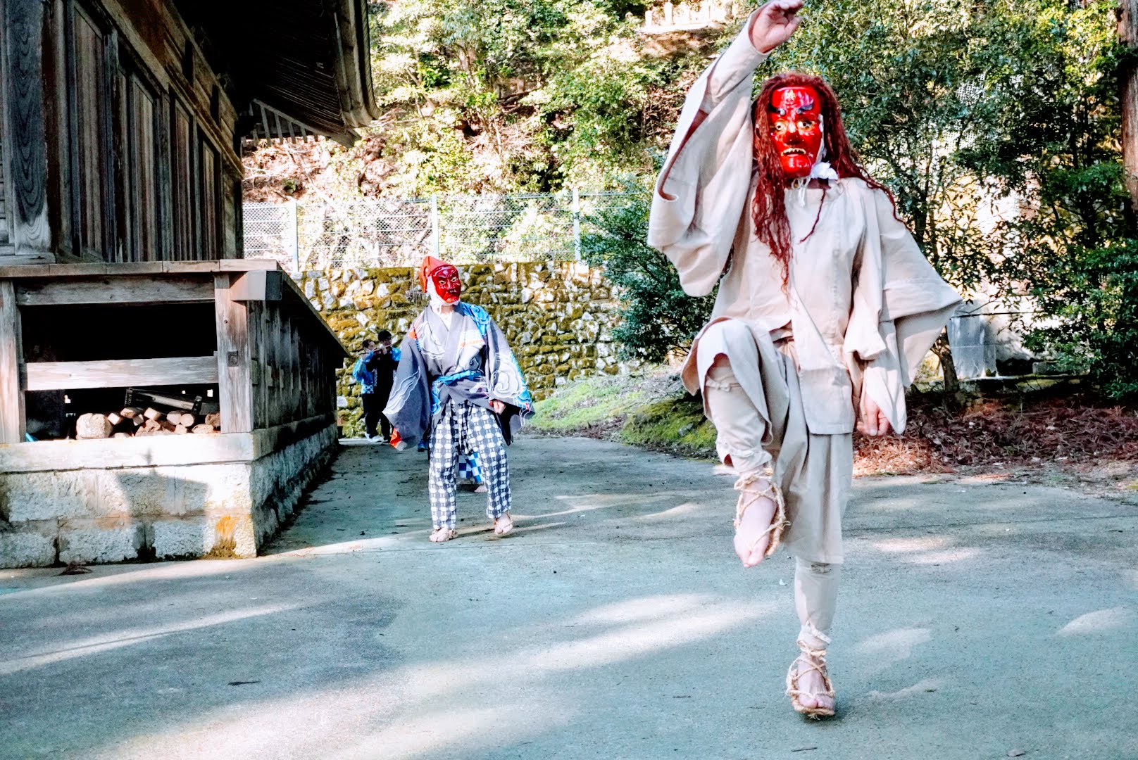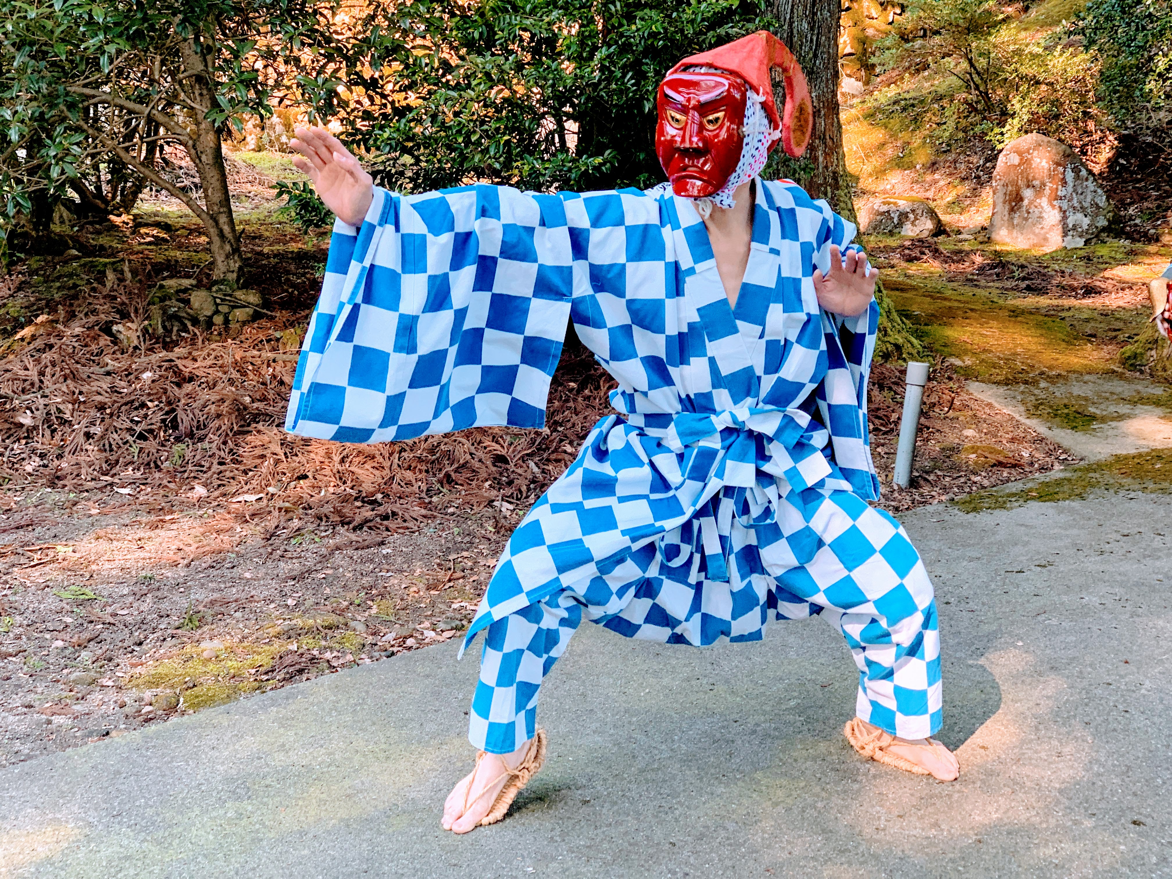 まず天狗面が一行の先頭に立ち、昇竜拳のように片手を高く上げて垂直にピョンピョン跳ねる南蛮踊りを踊ります。