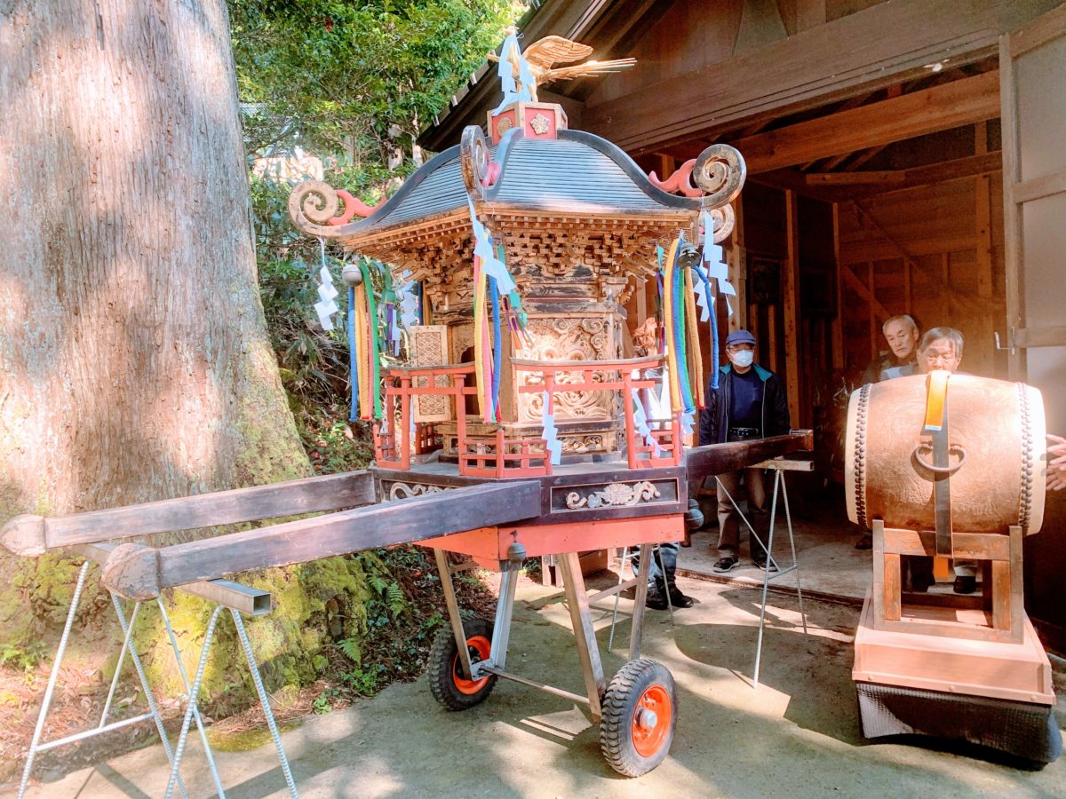 その頃、地元の人々は神輿と太鼓を倉庫から出して準備していました。下に台車を装着し、省エネ仕様にカスタマイズされたお神輿と太鼓。現在では担ぎ手が少なくなってしまったための措置だそうです。五色の布が取り付けられ、きれいになりました。